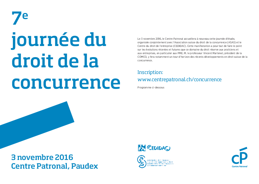 Le 3 novembre 2016, le Centre Patronal accueille la 7e Journée du droit de la concurrence, organisée conjointement avec l'Association suisse du droit de la concurrence (ASAS) et le Centre du droit de l'entreprise (CEDIDAC).