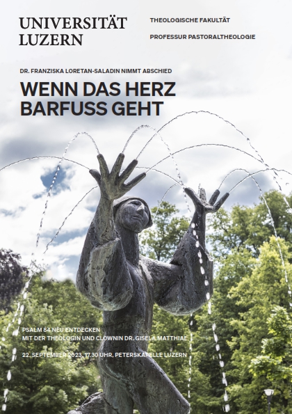 Theologin und Clownin Dr. Gisela Matthiae spielt und singt anlässlich des Abschieds von Homiletikdozentin Dr. Franziska Loretan-Saladin unter dem Titel «Wenn das Herz barfuss geht» zu Psalm 84.