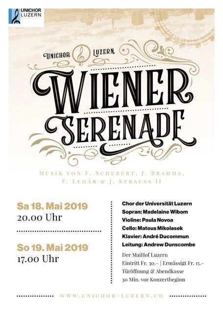 Am 18. und 19. Mai lädt der Chor der Universität Luzern ein zu einer Wiener Serenade mit Musik von Franz Schubert, Johannes Brahms, Franz Lehár und Johann Strauss II. Ein musikalischer Abend mit Operetten, Folkloreliedern und schwungvoller Tanzmusik im Wiener Stil.