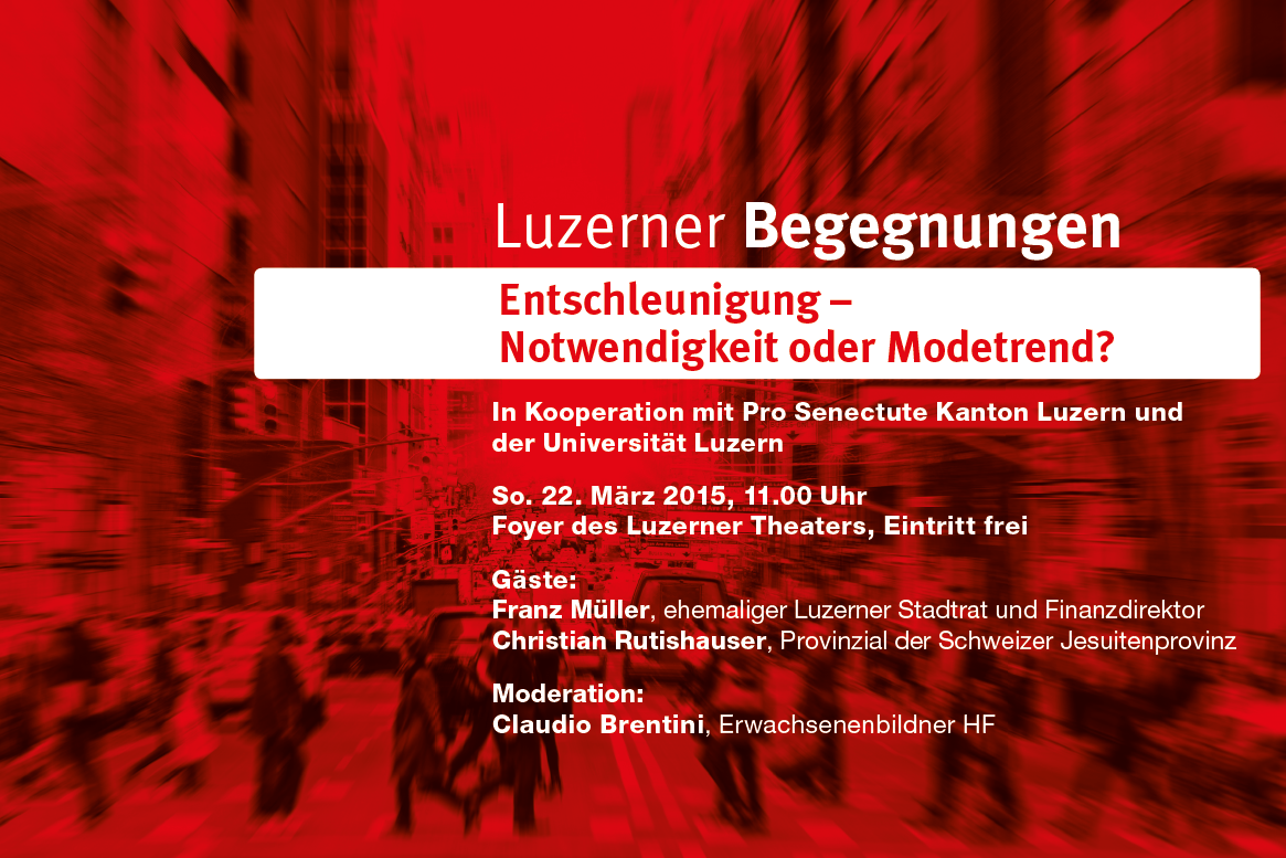 Am Sonntag, 22. März 2015, um 11 Uhr findet im Foyer des Luzerner Theaters eine weitere Ausgabe der öffentlichen Gesprächsreihe "Luzerner Begegnungen" statt. Thema diesmal: "Entschleunigung".