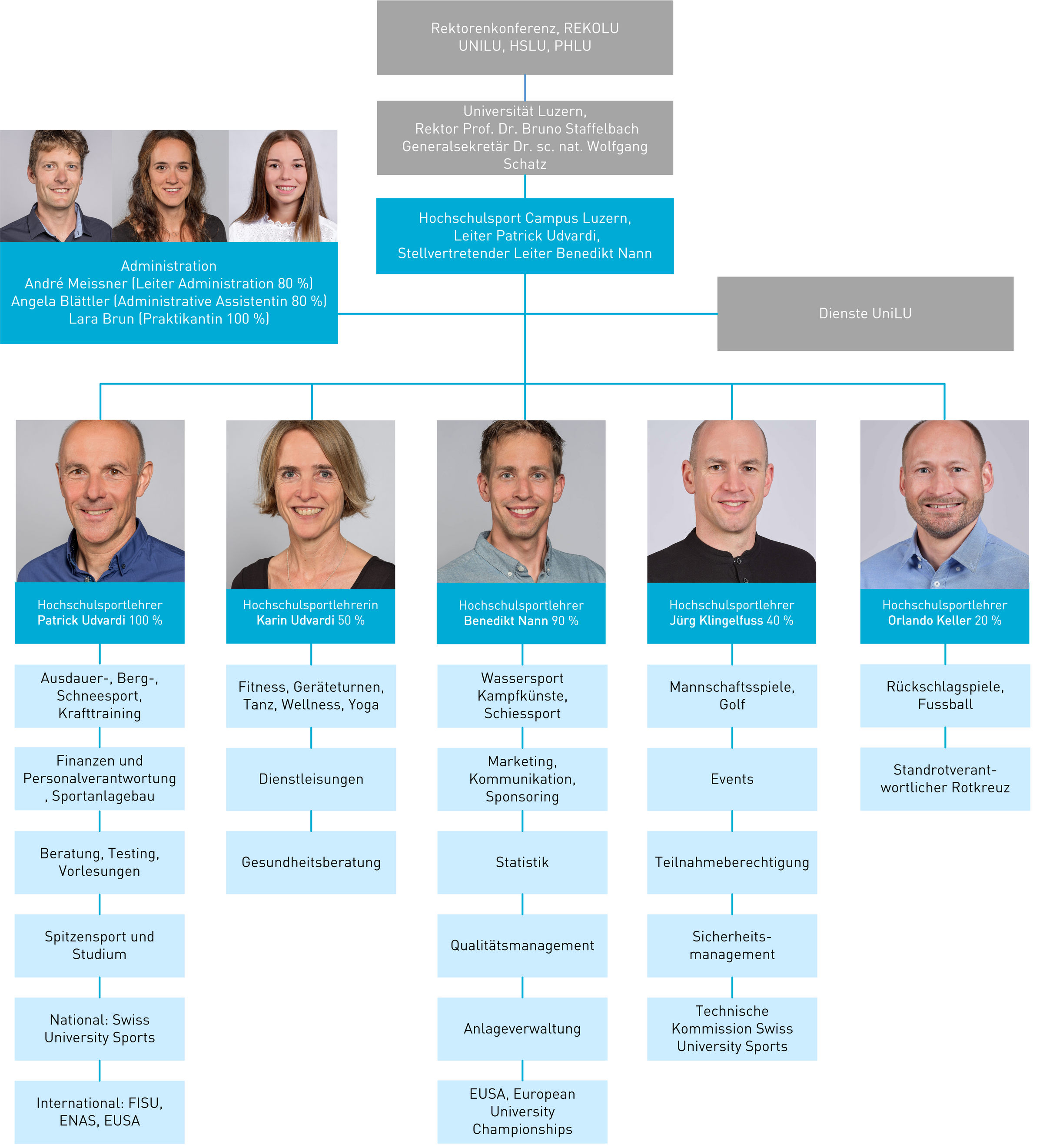 Ganz herzlich bedanke ich mich bei den drei Hochschulleitungen, den Partnerinstitutionen sowie bei unseren Sponsoren Ochsner Merchandise (Nike) und dem Kanton Luzern (Swisslos). Ihre Unterstützung und ihre Identifikation mit unserer Hochschulsportorganisation sind ein wichtiger Erfolgsfaktor für die Weiterentwicklung des gesamten Angebotes auf dem Hochschulbildungsplatz Luzern.