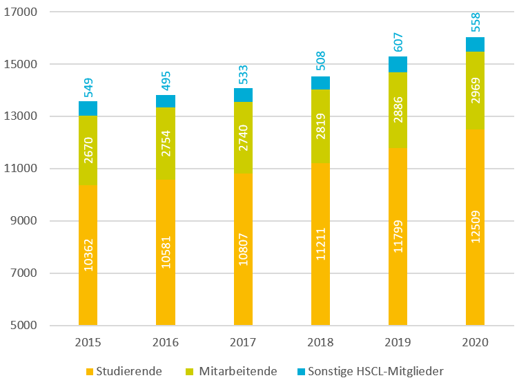 Die Anzahl «Total HSCL-Berechtigte» von 16’036 (+5 % im Vergleich zum Vorjahr) entspricht der effektiven Campus Grösse des HSCL und setzt sich zusammen aus der Anzahl Studierenden (12’509) und Mitarbeitenden (2’969) aller drei Hochschulen sowie den sonstigen HSCL-Mitgliedern (Alumni, Trainingsleitende, Gäste und Partnerschulen: 558).