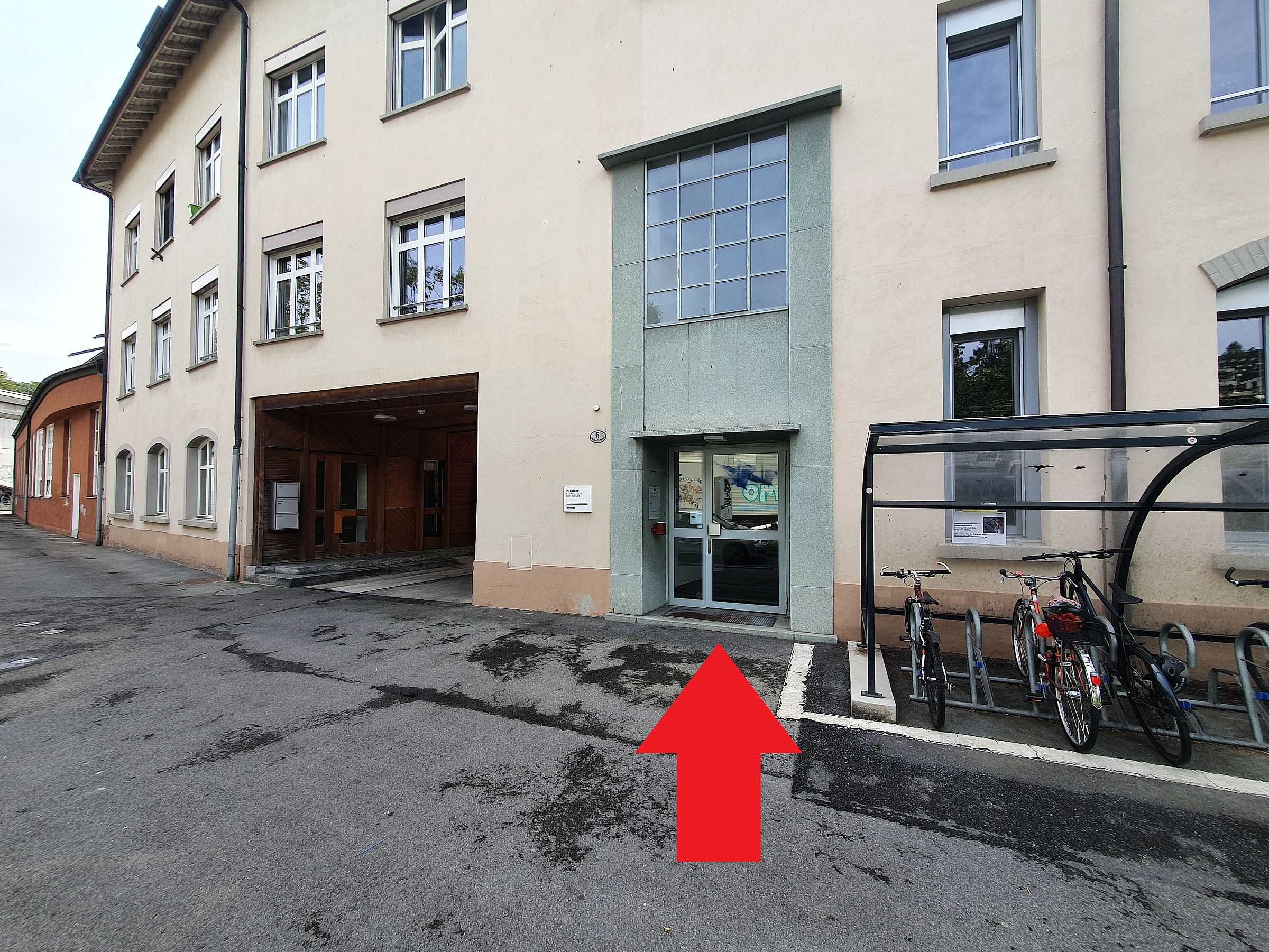 Der Eingang zum Büro befindet sich auf der Seite bei der Reuss (siehe Foto unten). Um ins Gebäude zu kommen, musst du bei uns klingeln, damit wir dir aufmachen können. Während den Öffnungszeiten der PHLU kann man auch den Haupteingang an der Sentimattstrasse 1 nutzen und den Innenhof durchqueren.