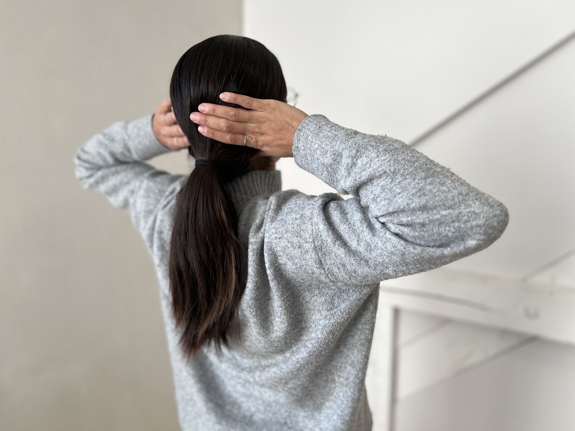 - Startposition: Setze dich aufrecht auf einen Stuhl. Lege die Hände hinter den Kopf, die Finger hinter die Ohren und halte die Ellbogen nach aussen.
