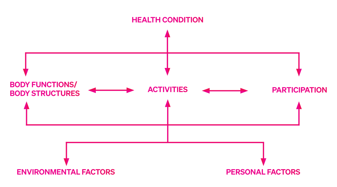 As the graph represents, the International Classification of Functioning, Disability and Health (ICF) developed by the WHO offers a model that shows health as a result of the dynamic interaction between a person’s body functions and structures, their activities and participation in daily life, and the environmental and personal factors that shape these experiences.