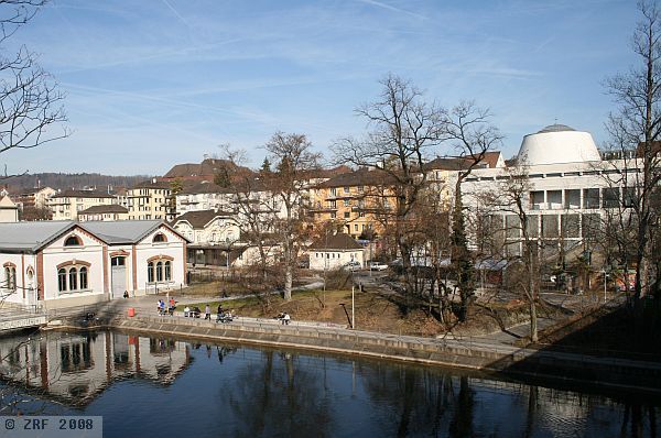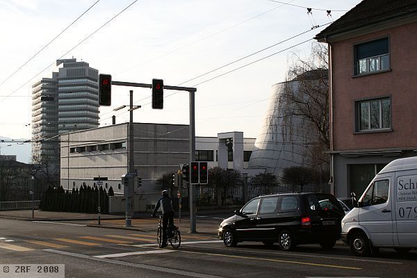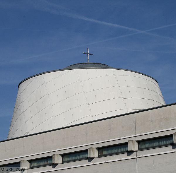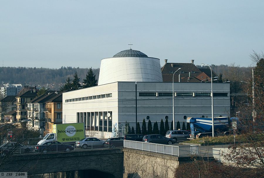 Limmatplatz Zurich, we cross the Sihlquai, undeterred by the noise and smells of the busy traffic at Kornhausbrücke. Below flows the sluggish Limmat river. Commercial buildings and apartments blocks are stacked up on both sides of the river. At the northern end of the bridge stands a modern, white-grey, rectangular building. The only noticeable feature is the conical tower rising from the roof. Coming closer, a small, dark-grey dome is visible on the roof. It is still difficult to make out the small silver-grey cross which tops it.