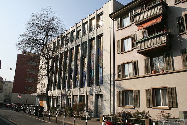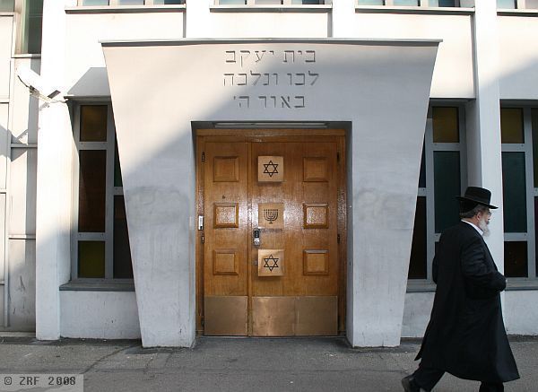 Zurich-Aussersihl. Almost uninterrupted traffic crosses the former working-class area along Weststrasse. Now and again we encounter a few people in Orthodox Jewish clothing, the Hasidim. At the end of Erikastrasse on the right-hand side is an obviously much-visited building with two entrances, one on the adjoining street: the synagogue of the Ashkenazi-Jewish parish Agudas Achim («community of brothers»). The entrance on Weststrasse is inconspicuous. It serves as the entrance for female visitors to the «esrat nashim», the women’s gallery. The second door, on the corner of Erikastrasse and Weststrasse, is the men’s entrance. It is covered by a plain concrete canopy, above which two tablets proclaim the Ten Commandments written in Hebrew. Tall windows rise up the building’s façade – made from bulletproof glass, as we will hear more of later. The simple cubic style gives this house of prayer the appearance of a functional building. It must simply be nearby to where its users live, even if this means it lies on the busy Weststrasse.