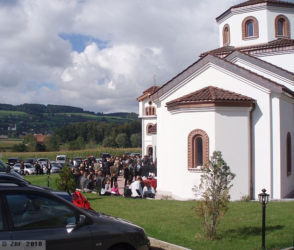 The parish council then asked the architect to prepare a new draft based on a more classical model, along with Todor Paskali, architect and government advisor in Macedonia. Having been approved by the planning authorities, the final details were worked out by the architects Marjan Cvetkovic in Wald, ZH, and Rudolf Bucher in Schenkon, LU. In order for the church to fit into the local surroundings, it was not built in natural stone as would be Macedonian tradition, but in white plastered concrete. Village clerk Wyss finds the traditional appearance unproblematic: «It looks good, receives compliments, and did not receive any resistance from the local population.» The Macedonian community is also satisfied. Their secretary Venko Stoicov says proudly: «It has all the features of our religion, such as the cruciform layout and the cupola, which are symbolic for our Church.»