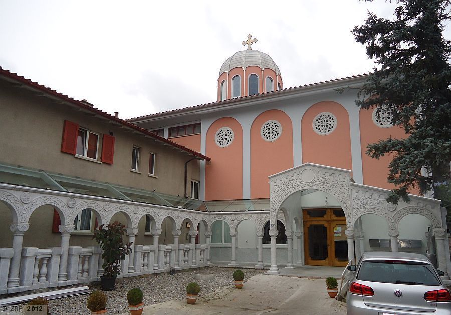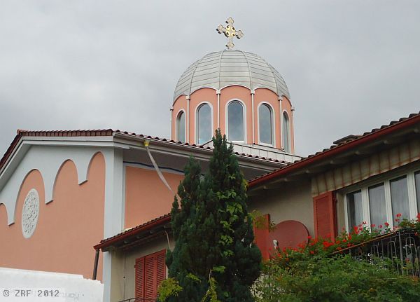 Zurich, Schwamendingen. Just next to a large road, and surrounded by houses, stands the Serbian-Orthodox Church of the Assumption. With its dome and ornate marble columns at the entrance, the building looks like something from another world. There is a house attached to the church in which the parish priest lives. The church was originally built by the New Apostolic Church and later converted to the Orthodox Christian style.