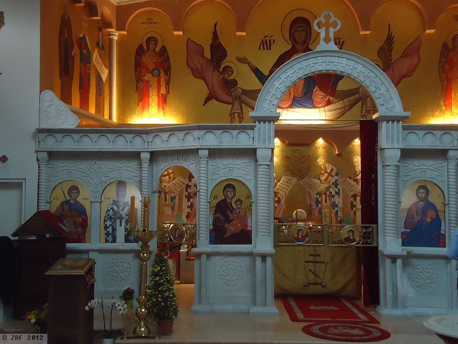 The prayer room of the church is, rather unusually, upstairs, but is accessible to the disabled thanks to a newly installed stair lift. Unlike most other Orthodox iconostases the Schwammendingen iconostasis is made from marble. To demonstrate ties to Switzerland and the city of Zurich, the altar has icons of the city's martyrs Felix and Regula.