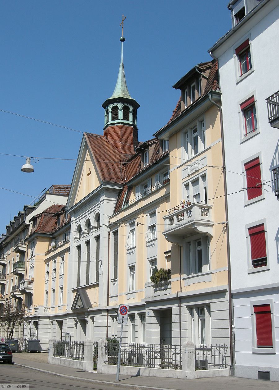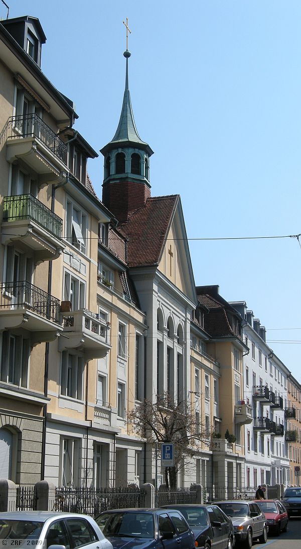 If one travels to the tram stop «Kalkbreite» in Zurich, then goes south towards the next quarter, one quickly finds oneself at the tram depot on Elisabethenstrasse. Following this road, at the end of the row of dormer windows one comes across a small grey-green bell tower. The well-suited style of the building fits seamlessly amidst the row of houses, but as one approached, it becomes clear that it is a Christian church. Beneath the tympanum, the triangular gable, and the high-arched windows, another small tympanum covers the entrance. At its centre a Christ figure can be seen in a relief on a gold background. Beneath it is written in golden Cyrillic letters: «Chram Svete troitze», or, «Church of the Holy Trinity».