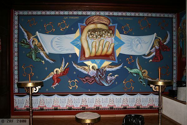 The interior is now packed with Byzantine wall paintings. Some of the icons have been placed in the open entrance and can be seen from the street. A «little consecration» of the iconostasis took place in September 2001 (see picture below). Six years later the congregation finally cast the missing bell and on 29th May 2007 hung it in the tower. The final expansion of the basement began in January 2008, where the organ had been stored until 2007. Only when this part is also ready to be used will the church finally be consecrated.