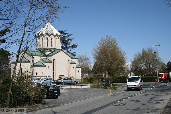 On the right of the church porch is a memorial which commemorates the genocide of the Armenian people. Behind the church is the Armenian centre of Geneva. It has a stepped cube-shaped form, and its earth-red tones fit well into the rural surroundings.