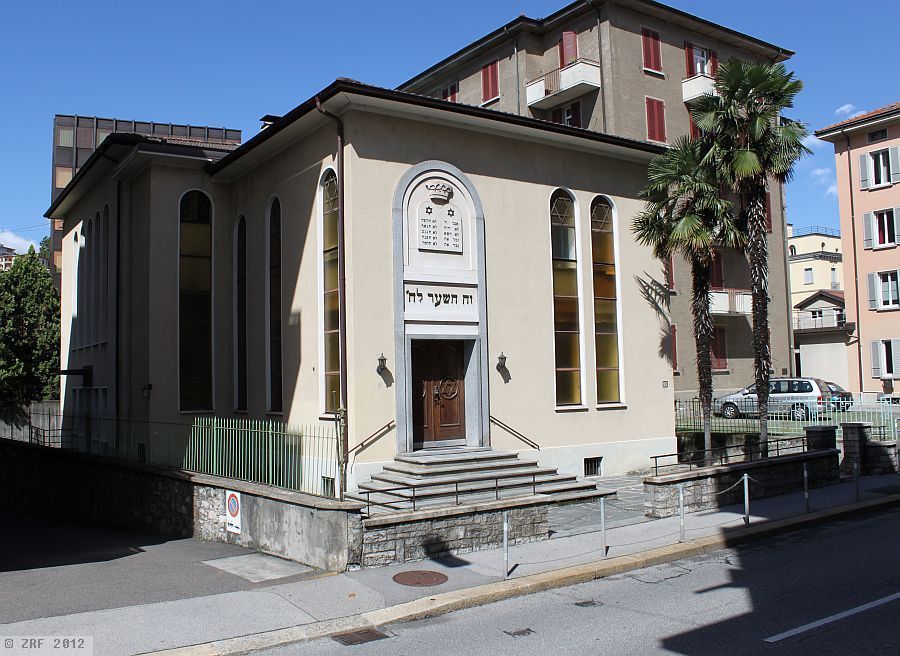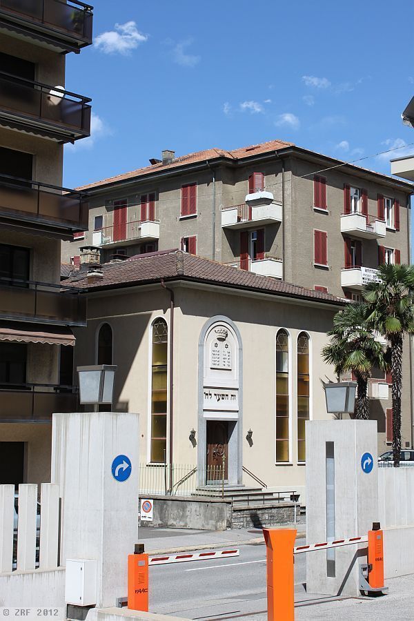 Above the entrance, a black inscription in relief can be seen in Hebrew letters, and above that two tablets, also containing Hebrew letters and a crown – the tablets containing the Ten Commandments, a reference to the Mosaic tradition which is cultivated here. To the right of the entrance, running nearly the whole height of the building, are two slender arched windows with the Star of David above them (Magen David in Hebrew). The same symbol can be seen on both wings of the wooden entrance door. There is no doubt that we are standing in front of the synagogue of the Comunità Israelita Lugano.