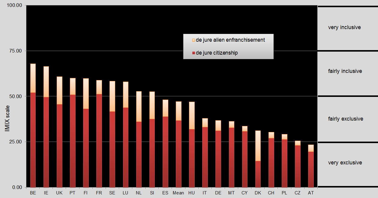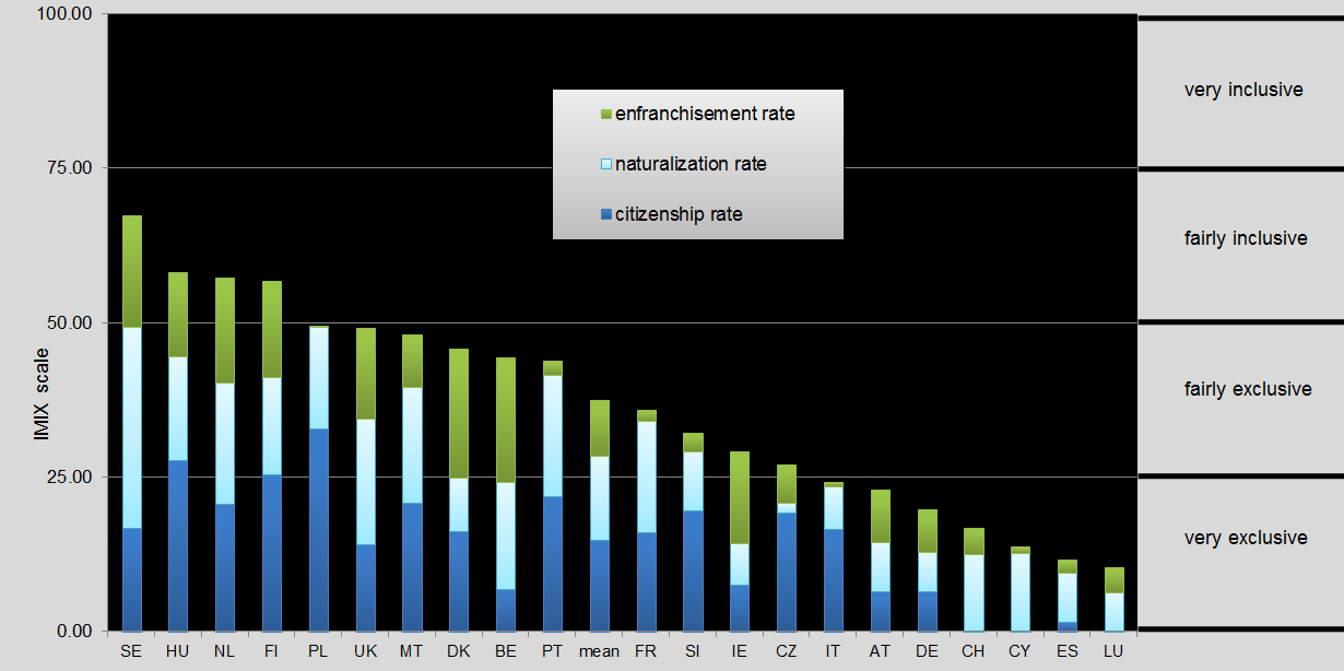 Furthermore, we take into account the two possible roads to electoral inclusion: access to citizenship (more conservative), and alien enfranchisement (more progressive). We give more weight to access to citizenship, which is the dominant and more conservative option. The more progressive one’s outlook, the more weight can be given to alien enfranchisement. We provide disaggregated data so the user can choose these weights her- or himself.