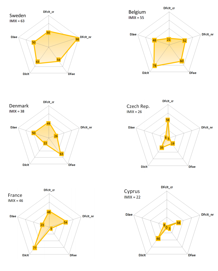 The following graphics show some notable country configurations, with examples evenly distributed along the IMIX scale. This points to a further possible usage of our tool, which is to analyze differente 'varieties of electoral inclusiveness with respect to immigrants'. Moreover, such analysis may also serve as starting points for more in-depth single and/or configurative comparative case studies.