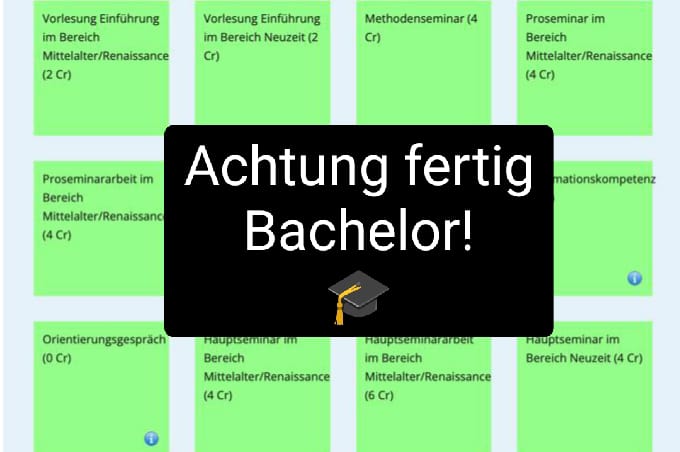 Mein persönlicher Pfad zum Bachelortitel begann grau. Doch mit jeder bestandenen Prüfung, jeder besuchten Veranstaltung und jeder verfassten Arbeit wich das Grau einem strahlenden Grün. Wissensschritt für Wissensschritt, Kästchen für Kästchen, haderte, lernte, triumphierte ich. Und heute habe ich es geschafft: Wie kleine Trophäen des Wissens stehen die grünen Kästchen in einer sauberen Kolonne. Allerdings nicht alle, denn in einer kleinen Reihe ganz unten stehen drei Kästchen in einem fast trotzig wirkenden Grau: Das Bachelorverfahren.