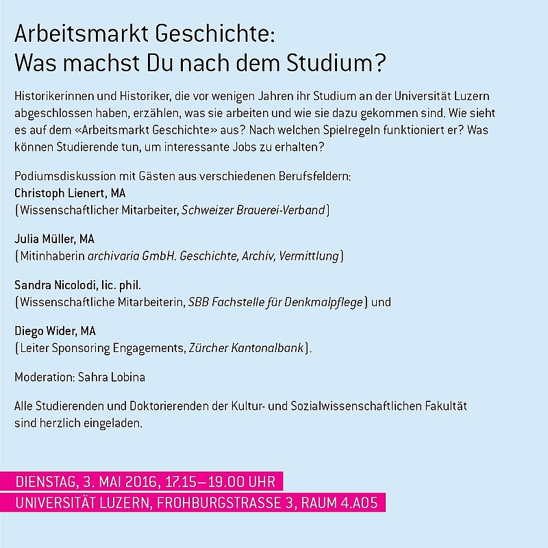 Am 3. Mai 2016, von 17.15 - 19.00 Uhr findet im Raum 4.A05 im Rahmen des Forschungskolloquiums Vormoderne eine Podiumsdiskussion mit Gästen aus verschiedenen Berufsfeldern statt, welche vor wenigen Jahren ihr Geschichtsstudium an der Universität Luzern abgeschlossen haben.