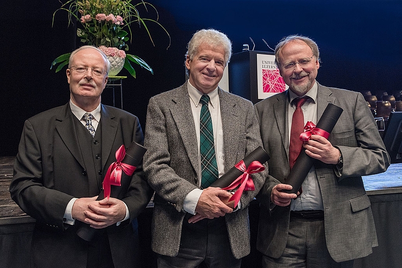 Mit der Ehrendoktorwürde wurden Prof. Dr. Heiner Bielefeldt, Prof. Dr. Colin G. Calloway und Prof. Dr. Dr. h.c. Ulfrid Neumann bedacht. Der Credit Suisse Award for Best Teaching ging an Prof. Dr. Birgit Jeggle-Merz, ausserordentliche Professorin für Liturgiewissenschaft. Der Universitätsverein verlieh seine Dissertationspreise an Dr. theol. des. Maria Hässig, Dr. des. Martin Weder und Dr. iur. Jonas Rüegg. Florian Lichtin, Vorstandsmitglied der Studierendenorganisation Luzern SOL, wandte sich im Namen der Studierenden ans Publikum. Das Schlusswort hielt Regierungsrat Reto Wyss, Vorsteher des Bildungs- und Kulturdepartements.