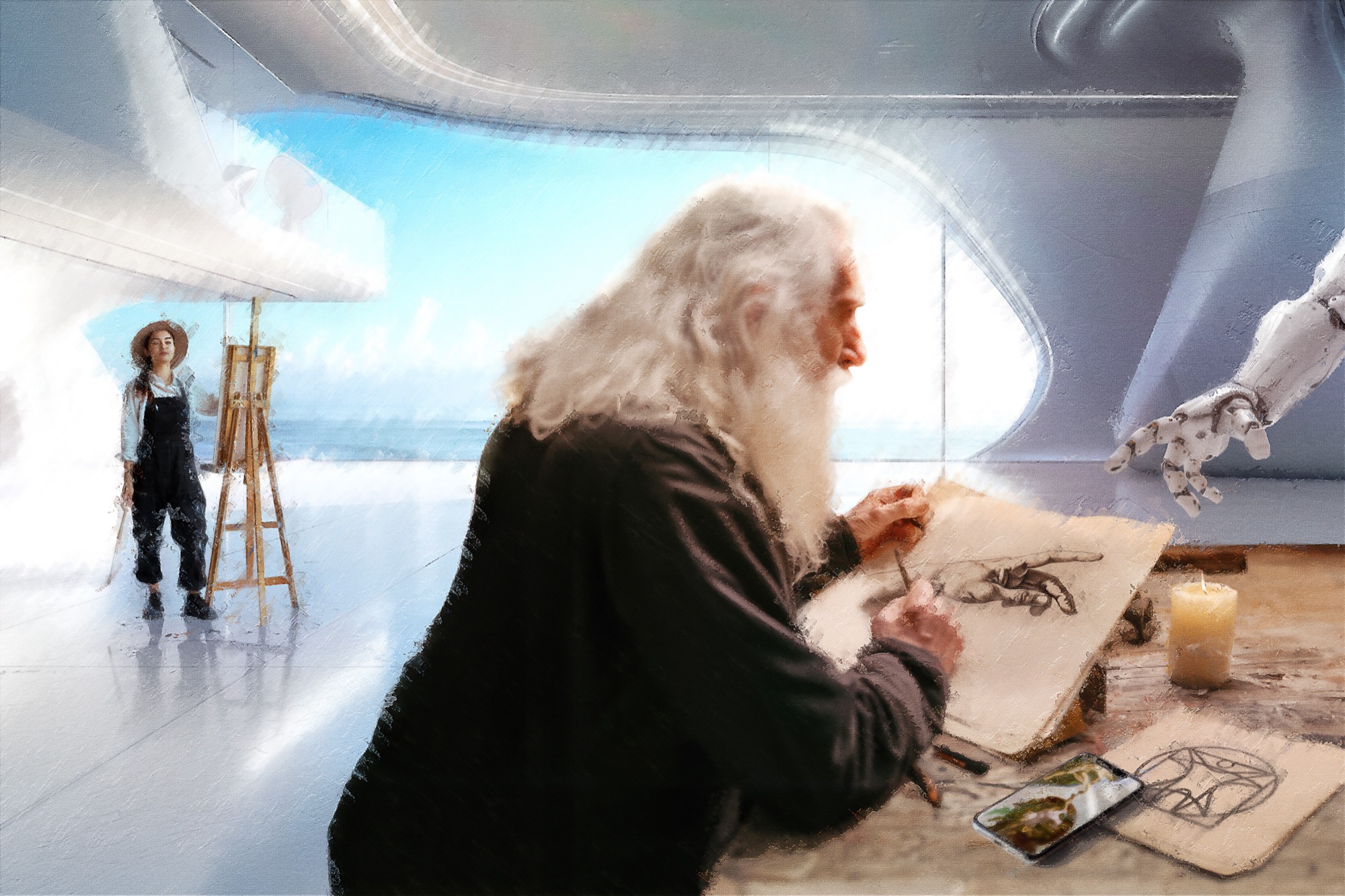 How can the focus on the human sciences be visualised? This is the subject of the report's accompanying series of images. In terms of design, it represents a synthesis between image generation based on machine learning using "prompts" and conventional manual digital image processing. The cover motif featuring Leonardo da Vinci is illustrative of this: Carefully observing the environment, its people and institutions, reading, analysing, categorising and contextualising – these are just a few of the methods and procedures used by the human sciences. And each of the double-page images in the centre section provides a wealth of information on what the human sciences are and what makes them so fascinating. To sum it up in the words of the University of Lucerne's motto: "Moving Human Sciences".