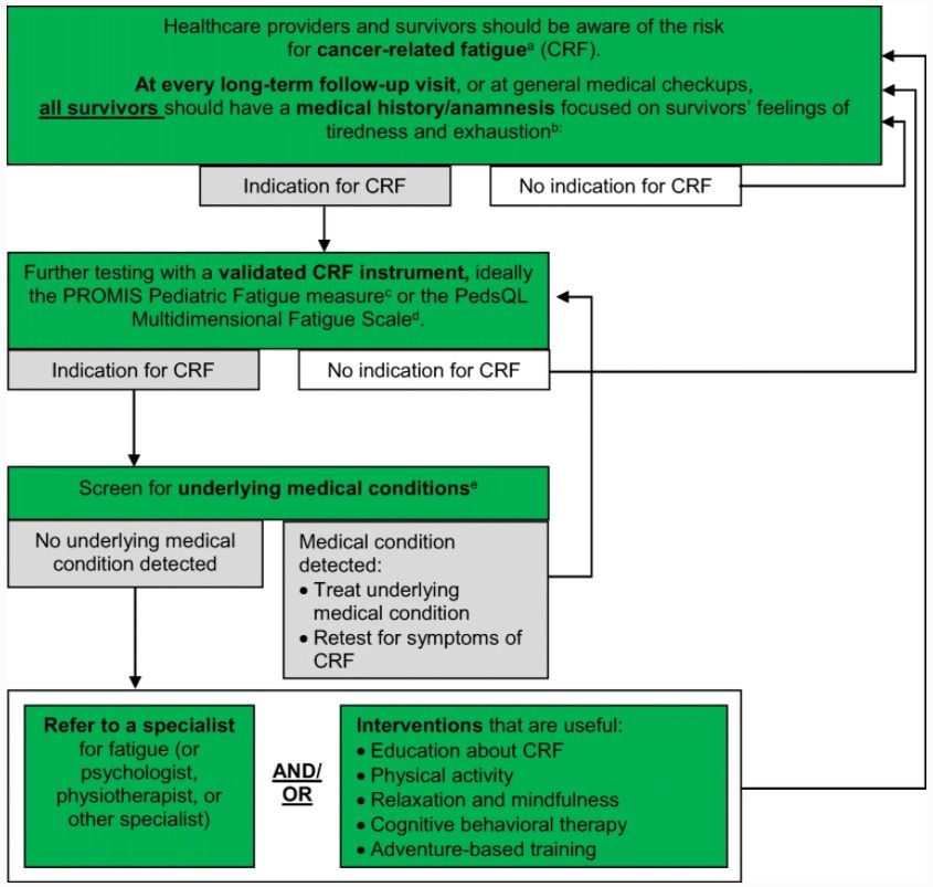 In the last decades, treatment of childhood and adolescent cancer has improved markedly. Most patients can be cured, but many suffer from late effects even decades after treatment ended. Cancer-related fatigue is a late effect experienced by many survivors. Regular follow-up appointments, in which survivors are systematically screened for late effects, are recommended for all survivors. Surveillance guidelines help to provide adequate follow-up care for all survivors.