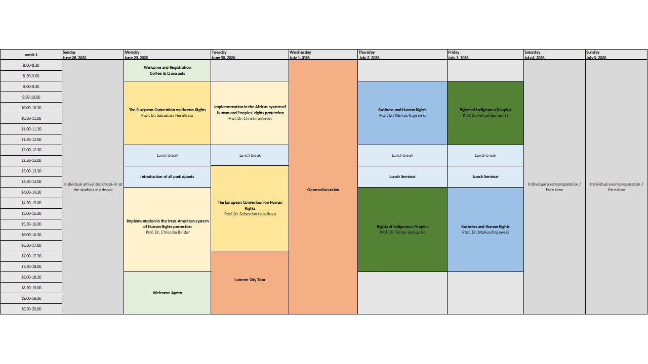 In 2026 the Lucerne Academy provides participants different courses focused exclusively on human rights law of the European Convention on Human Rights and the UN Covenants on Human Rights. All participants attend courses of their choice, three of which are mandatory. Participants take their written exams in these three mandatory courses. In the courses, the participants acquire necessary and fundamental theoretical knowledge. The classes are taught by distinguished professors and practitioners from around the globe.