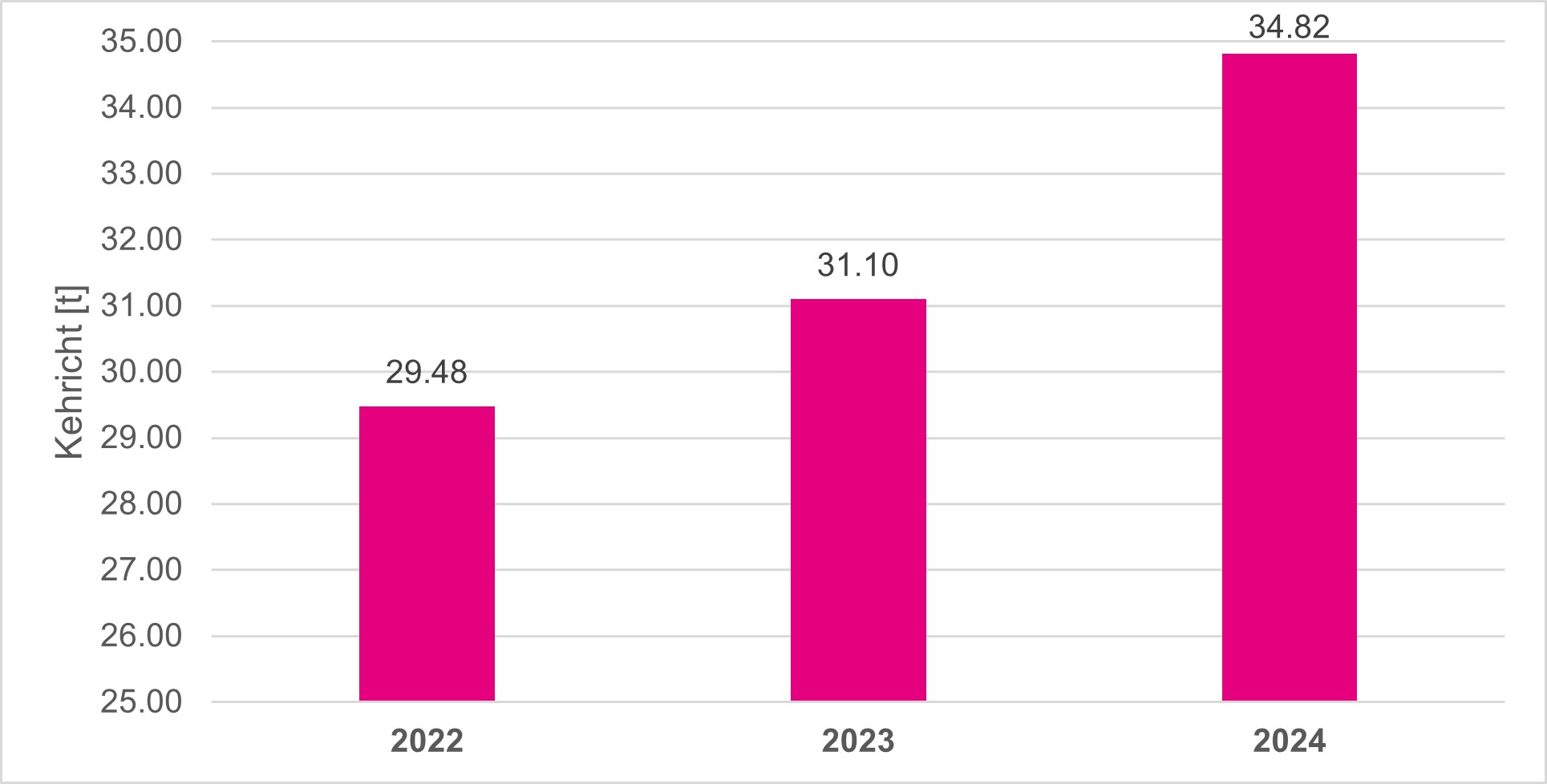 Domestic waste is waste that cannot be recycled and is incinerated in a waste incineration plant. This includes many packaging materials, for example. In 2024, the University of Lucerne generated 34.82 tonnes of waste. This was 11.96 % more than in the previous year (2023: 31.10 tonnes).
