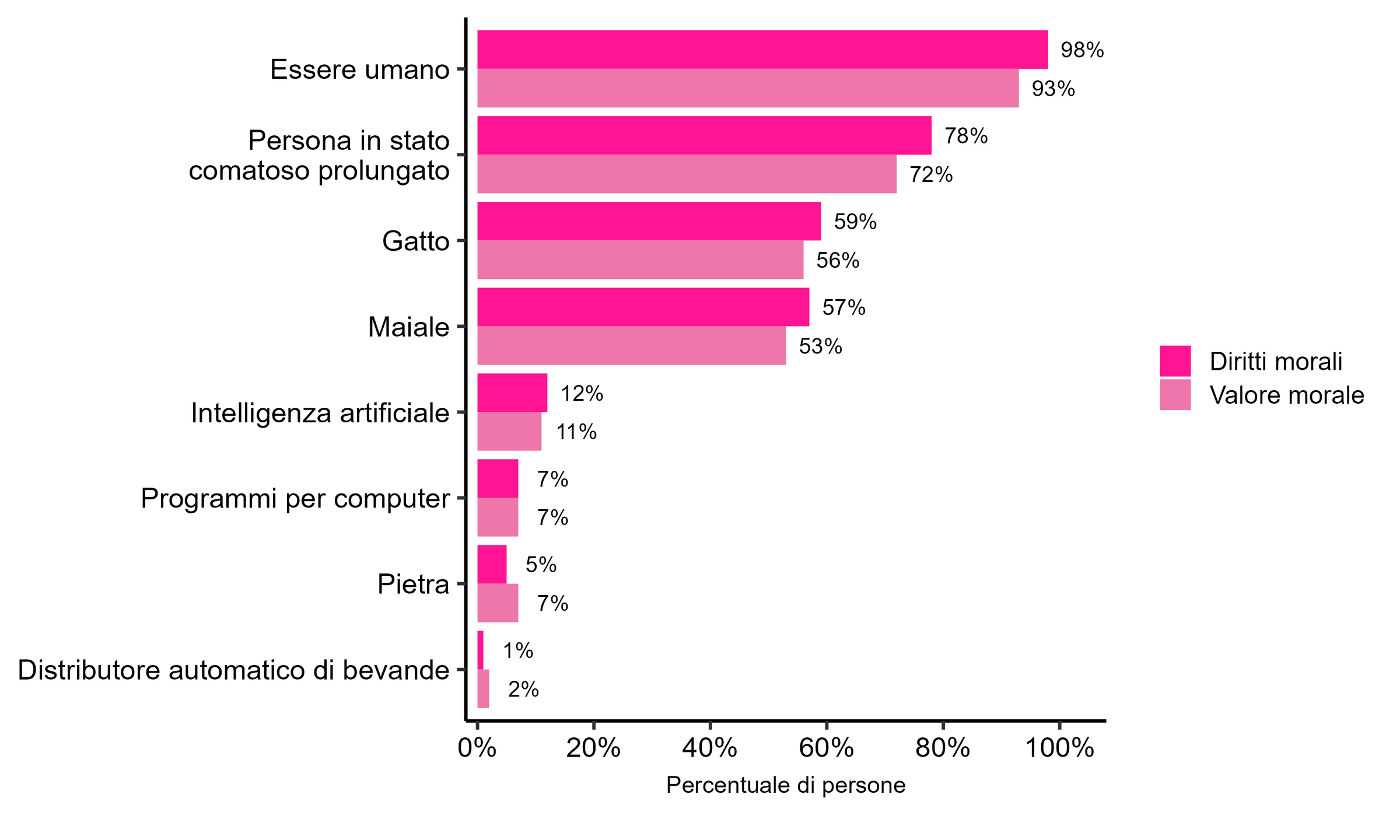 Più le moderne tecnologie di intelligenza artificiale diventano simili agli esseri umani, più si pone la questione se abbiano un valore morale o debbano avere diritti morali. Tuttavia, è improbabile che i partecipanti credano che questo sia già il caso. Solo una persona su dieci concorda sul fatto che l’intelligenza artificiale abbia un valore morale o debba avere dei diritti. Questo pone l’intelligenza artificiale solo leggermente più avanti dei semplici programmi per computer e ben al di sotto degli esseri umani o degli animali. Una spinta a dare diritti morali all’intelligenza artificiale sarebbe quindi sostenuta solo da una piccolissima minoranza.