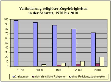 Für die Schweiz lassen sich die Prozesse der Pluralisierung auf der Grundlage der Eidgenössischen Volkszählungen 1970 bis 2000 und der Strukturdatenerhebung 2010 anschaulich festhalten. Es zeichnen sich hier drei prägnante Trends ab: