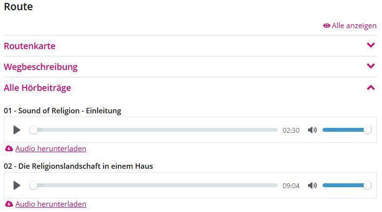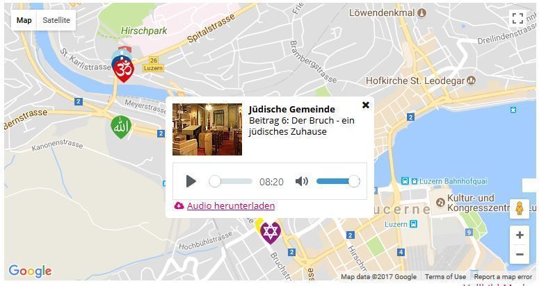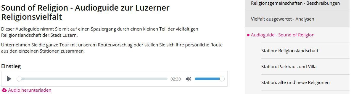 Für das Smartphone und Tablet steht ausserdem die App audioguideMe zur Verfügung. Hier können Sie sowohl den Audioguide zur Luzerner Religionsvielfalt, als auch die verwandten Projekte in Halle und Leipzig, sowie eine Reihe weiterer Audioguides anhören. Dieses Feature wird in Kürze zur Verfügung stehen.