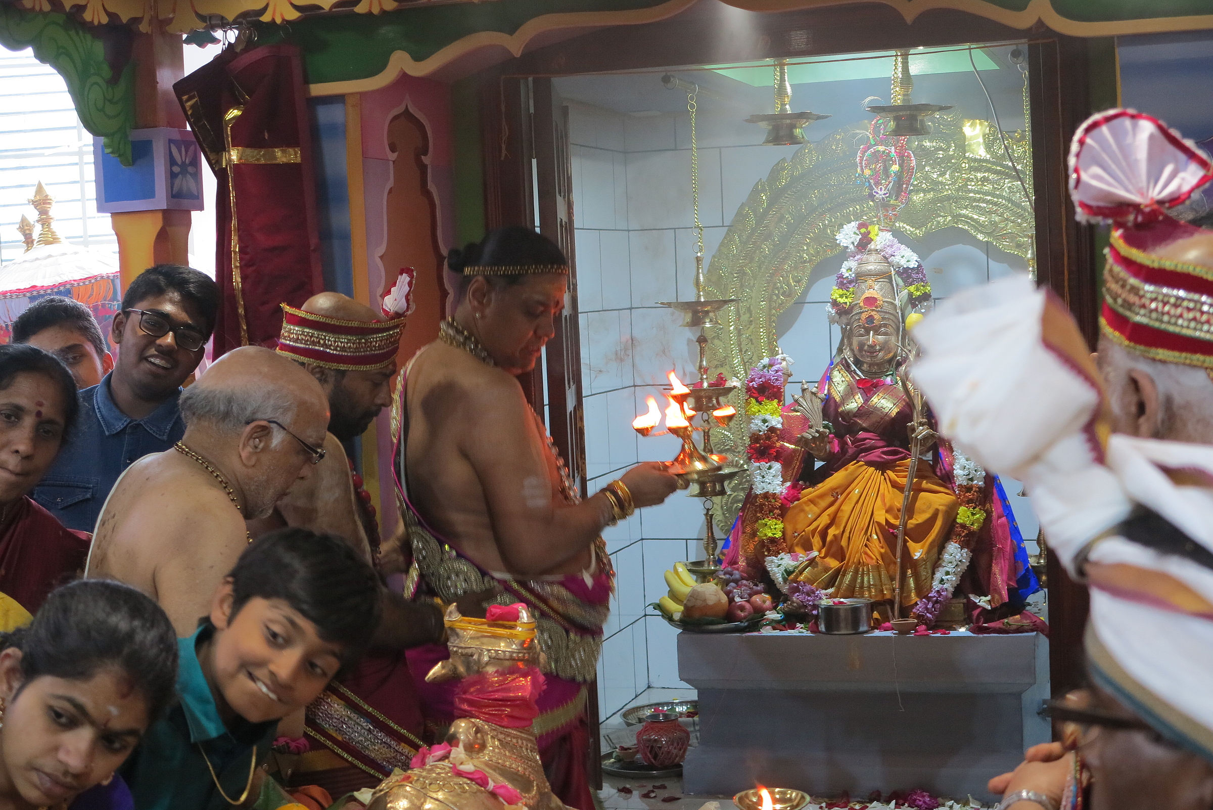 Der Priester und seine zwei Söhne, die mittlerweile die Verehrungszeremonien (pujas) selbständig durchführen können, verehren die Götter mit Licht, Klang, Blumen, Mantren und weiterem regelmässig dienstags und freitags am frühen Abend sowie an den verschiedenen hinduistischen Feiertagen. Zudem findet im Sommer jeweils das gross gefeierte Tempelfest statt, bei dem die Göttin aus dem Tempel herausgetragen wird und den Tempel in einer feierlichen Prozession, begleitet durch Musiker und viele Gläubige, umrundet. Überdies kommen Familien nach Voranmeldung zu speziellen Anlässen im Tempel zusammen, um unter Anleitung des Priesters gesonderte Rituale und familiäre Feste zu begehen.