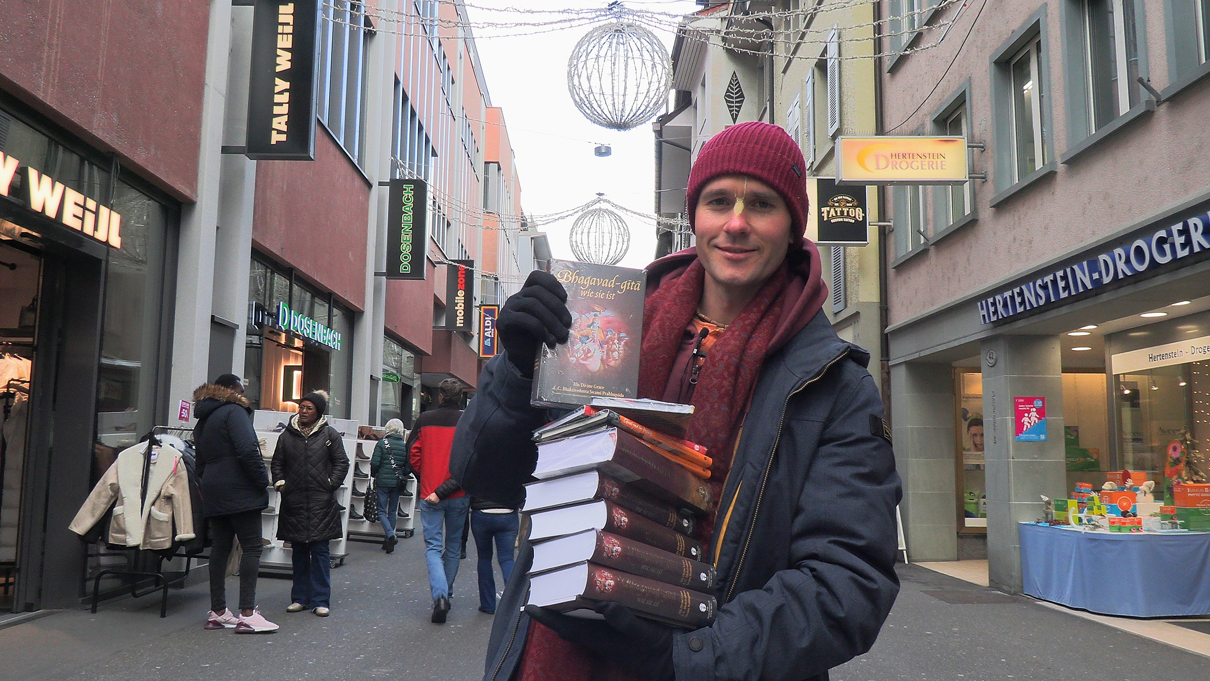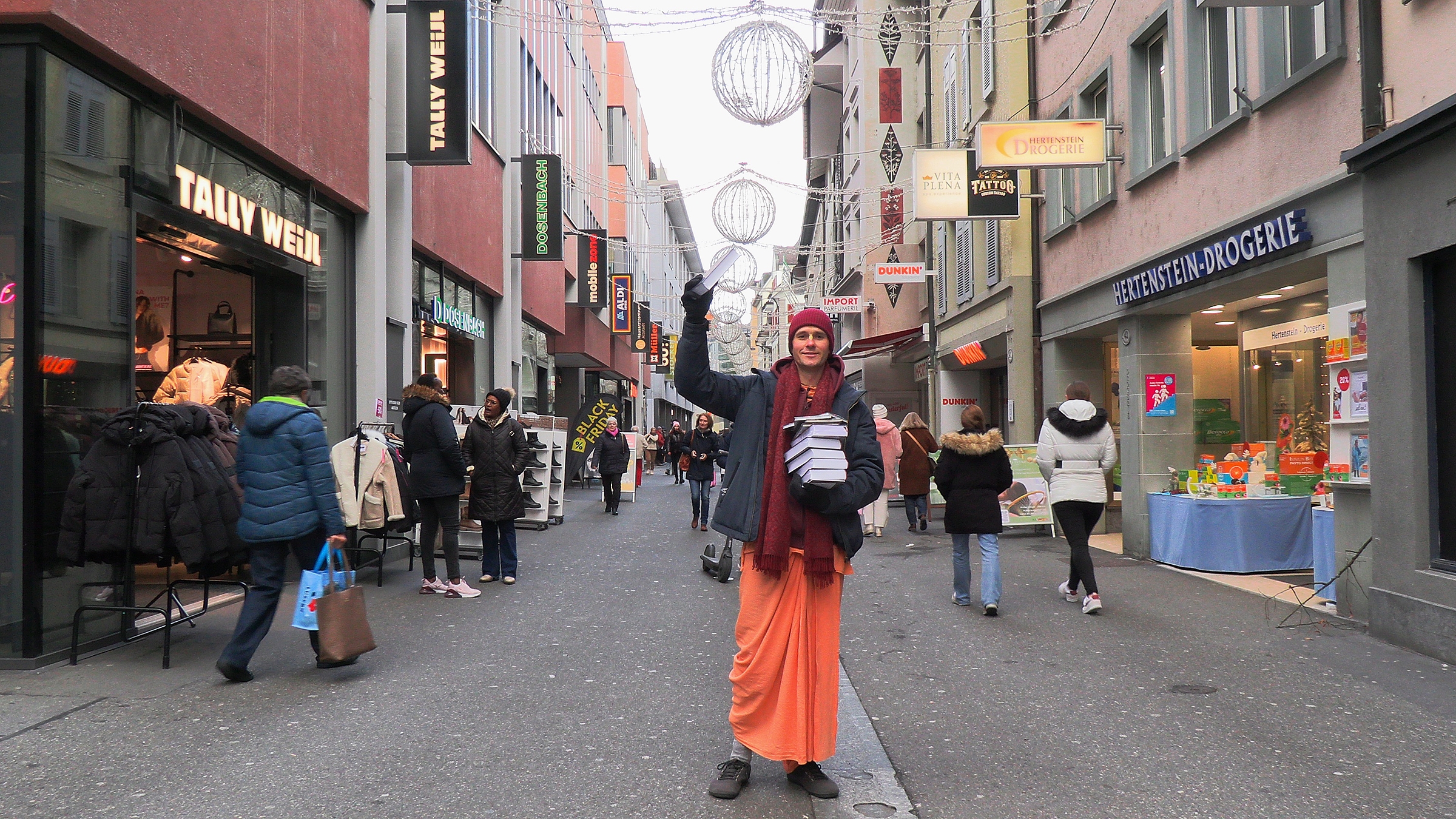 Ich fragte im Zürcher Tempel, ob ich einen ihrer Mönche begleiten könnte, wenn er wieder mal in meiner Stadt, Luzern, unterwegs ist. Die Antwort war positiv. Und so verbrachte ich einen Nachmittag mit Śikṣāṣṭakam Dās, während er in den Einkaufsstrassen Luzerns hinduistische Schriften verteilte.