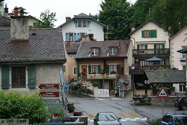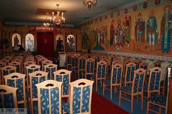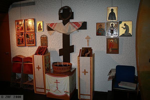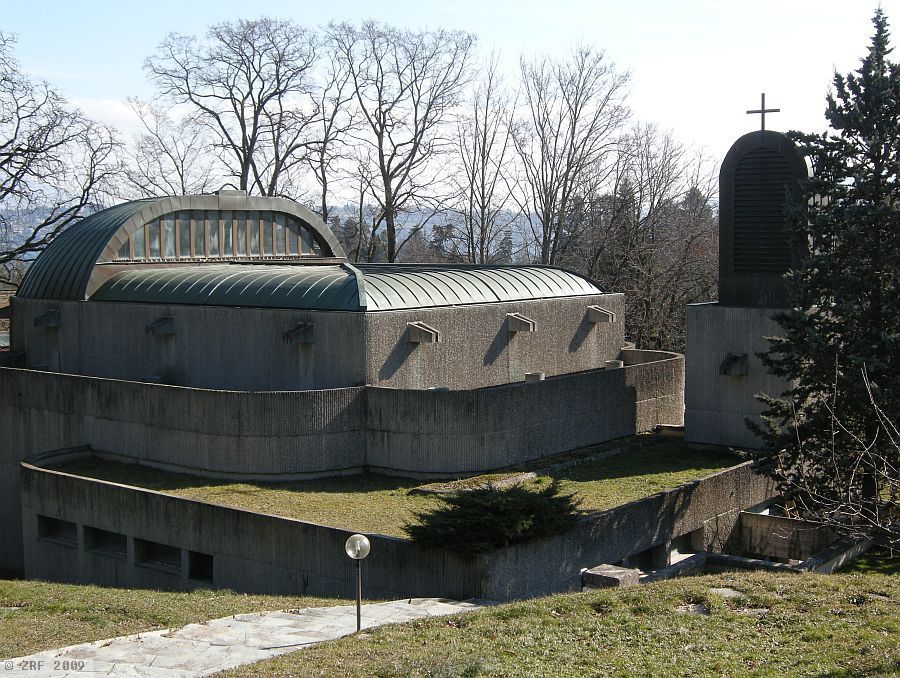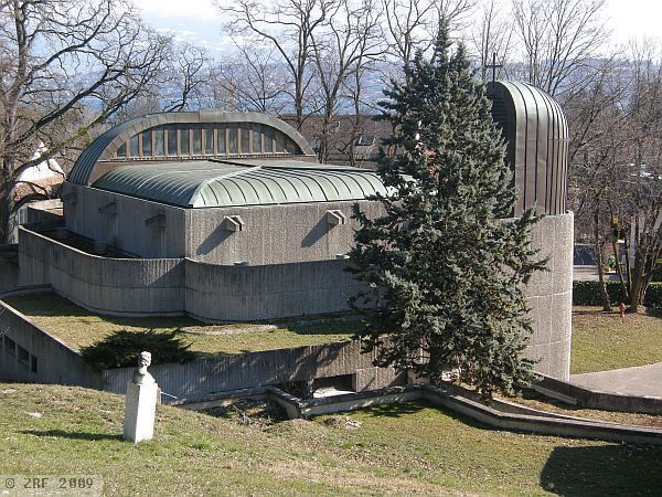 Der Zug bringt uns von Genf aus Richtung Lausanne in fünf Minuten bis zum malerischen Dorf Chambésy. An der Strasse Richtung Dorfzentrum zeigt uns linkerhand der Wegweiser «Centre orthodoxe» den Weg in den Chemin des Cornillons. Schon bald befinden wir uns vor einer ausgedehnten Grünanlage, aus der uns durch das Geäst eines stattlichen Laubbaumes ein moderner Gebäudekomplex entgegenschimmert. Beim Näherkommen erkennen wir ein dunkelgraues, abgerundetes Dach, dessen Stirn von einer Fensterfront durchzogen wird. Es fügt sich passend in die Gebäudelinien des schlichten Betonbaus ein. Vertikale Kanellüren verleihen den Rohbetonwänden Struktur. Ansonsten überwiegt die Horizontale. Alles in allem fällt die Schlichtheit und Klarheit der kurvigen Flächen und Linien auf.