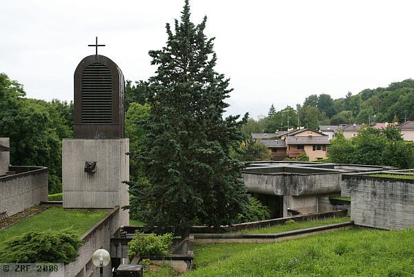 Gegenüber der Kirche und durch ein offenes Foyer verbunden, sieht man einen weiteren Gebäudekomplex, das «Centre Orthodoxe du Patriarcat Œcuménique», wie wir auf dem Stein links des Parkeingangs lesen. Der Rasenbewuchs auf der untersten Dachebene von Saint-Paul und den stufenförmigen Dächern des Zentrums unterstützt die Einbettung der Gebäude in die Grünanlage.