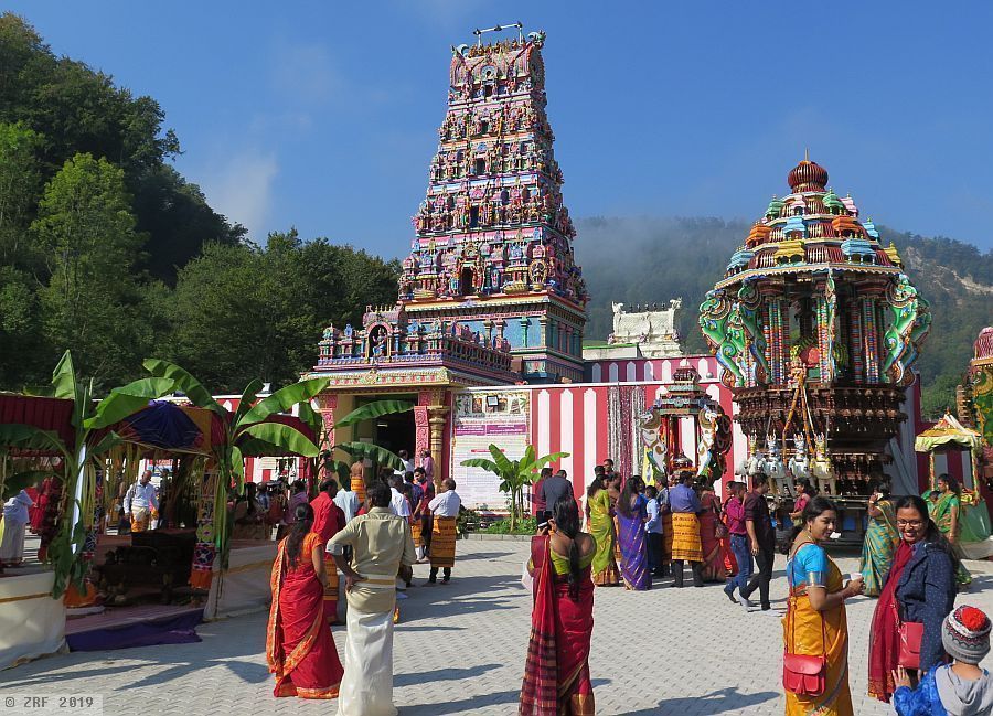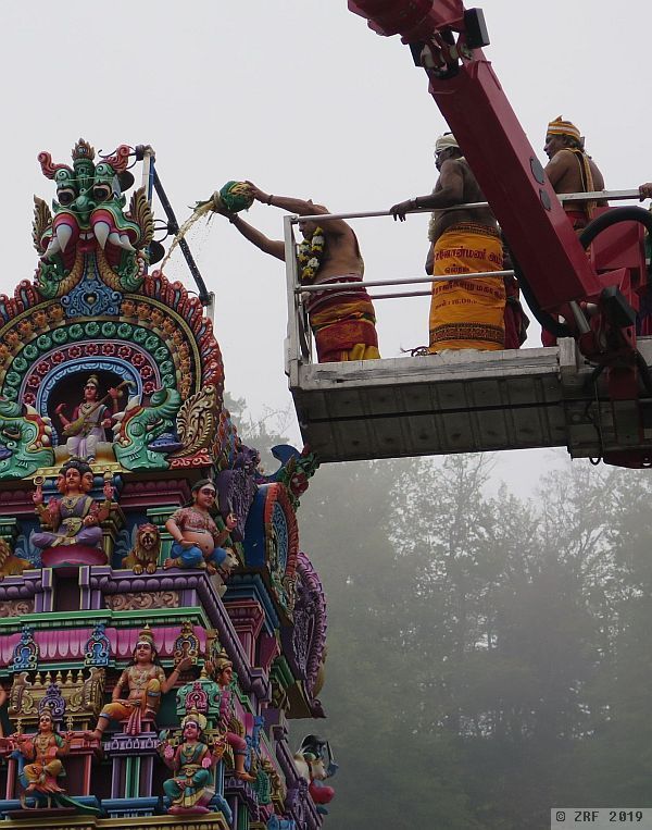 Der höhere der beiden Tempeltürme, der gopuram über dem Eingang, wurde mangels Finanzen zunächst als Betonrohbau stehen gelassen. Weil er religiös weniger bedeutsam ist als der kleinere vimanam, konnte die Einweihung der gesamten Anlage 2013 dennoch stattfinden. Um den gopuram ausschmücken zu lassen, holte der Verein 2018/2019 erneut indische Facharbeiter ins Land. Am 15. September 2019 wurde auch dieser sichtbarste Teil des Tempels mit einem grossen Fest eingeweiht. Bei zunächst noch nebligem Herbstwetter bestiegen die Priester die Hebebühne eines Krans, um wie sechs Jahre zuvor beim vimanam die sieben zwiebelförmigen Aufsätze (kalasha) mit dem Wasser der göttlichen Kraft zu übergiessen.