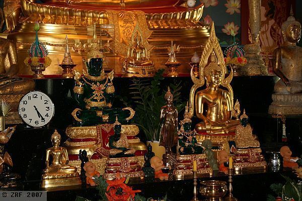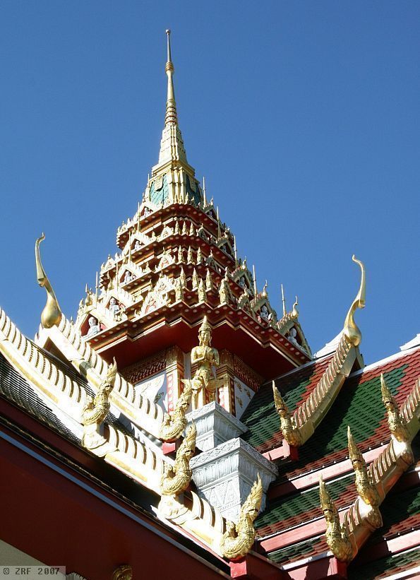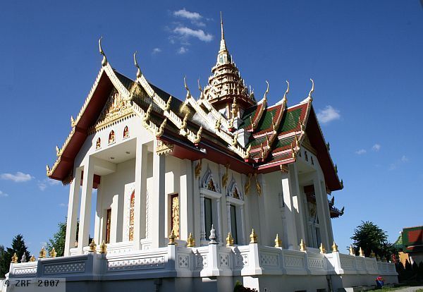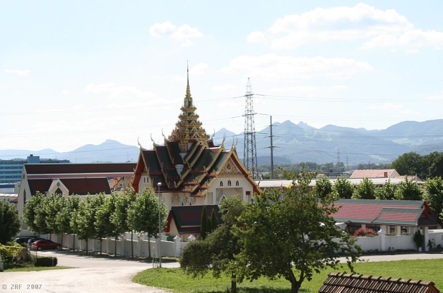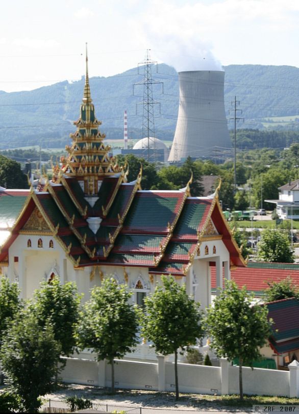 Gretzenbach, Staldenacker. Während der Bus, von Schönenwerd her kommend, weiter Richtung Dorfzentrum fährt, laufen wir abwärts ins Unterdorf, passieren das Wissbächli, das Restaurant Frohsinn zur Linken lassend. Nach 50 Metern folgt links die kleine Gewerbezone «Im Grund» der 2500 Einwohner zählenden Gemeinde zwischen Olten und Aarau. Doch nicht an Gewerbebauten bleibt das Auge hängen, sondern an einem reich verzierten Gebäudekomplex mit mehrfach abgestuft emporragender Dachsilhouette. Flammenähnliche, goldene Spitzen züngeln eng nebeneinander und zieren auf vier hintereinander liegenden Stufen die steilen Dachgiebel. Das kunstvolle Dachwerk gipfelt in einem aus der Mitte aufragenden, ebenfalls goldverzierten Turmspitz. Ungewohnt für die ländliche Idylle wirkt auch ein langer, geschotterter Parkplatz am Rande der obstbaumgesäumten Wiese vor der Anlage. In der Ferne hinter der Anlage ragt – welch ein Kontrast! – ein gewaltiger, schlichter Betonzylinder empor: der Kühlturm des Kernkraftwerks Gösgen, von Hochspannungsleitungen flankiert und seine Dampfschwaden gen Himmel schickend. Am Eingang des Gebäudekomplexes grüssen auf Glas gezeichnete goldene Lettern in ungewohnter, thailändischer Schrift, gleich darunter die Übersetzung lateinischer Schrift: «Wat Srinagarindravararam – Buddhistisches Zentrum».