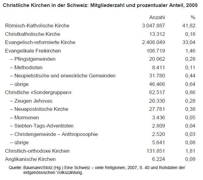Noch 1970 gehörten den verschiedenen christlichen Kirchen 97,8% der Schweizerischen Bevölkerung an. Dreissig Jahre später, im Jahr 2000, hatte sich der Anteil auf 79,3% verringert. Hauptgründe für den Rückgang kirchlicher Zugehörigkeit sind eine deutliche Zunahme der Rate von Kirchenaustritten. Insbesondere die reformierten Kirchen verloren von 1970 mit 46,5% bis 2000 mit 33% mehr als ein Viertel ihrer Mitglieder, im Jahr 2000 gehörten ihr 2,4 Millionen Mitglieder an. Der Anteil an Katholiken verringerte sich lediglich von 49,5% (1970) auf 42% (2000), Zuwanderungen aus Italien, Portugal, Spanien und weiteren katholisch geprägten Ländern wie auch eine z.T. stärkere Kirchenbindung liessen den Rückgang moderater als bei den Reformierten ausfallen. Der katholischen Kirche gehörten im Jahr 2000 etwas mehr als drei Millionen Mitglieder an. Im gleichen Zeitraum nahm der Anteil an Personen ohne religiöse Zugehörigkeit von 1,1% (1970) auf 11,1% (2000) markant zu. Auch der Anteil an Personen in nicht-christlichen Gemeinschaften erhöhte sich infolge von Migration von 0,7% (1970) auf 5,3% (2000).