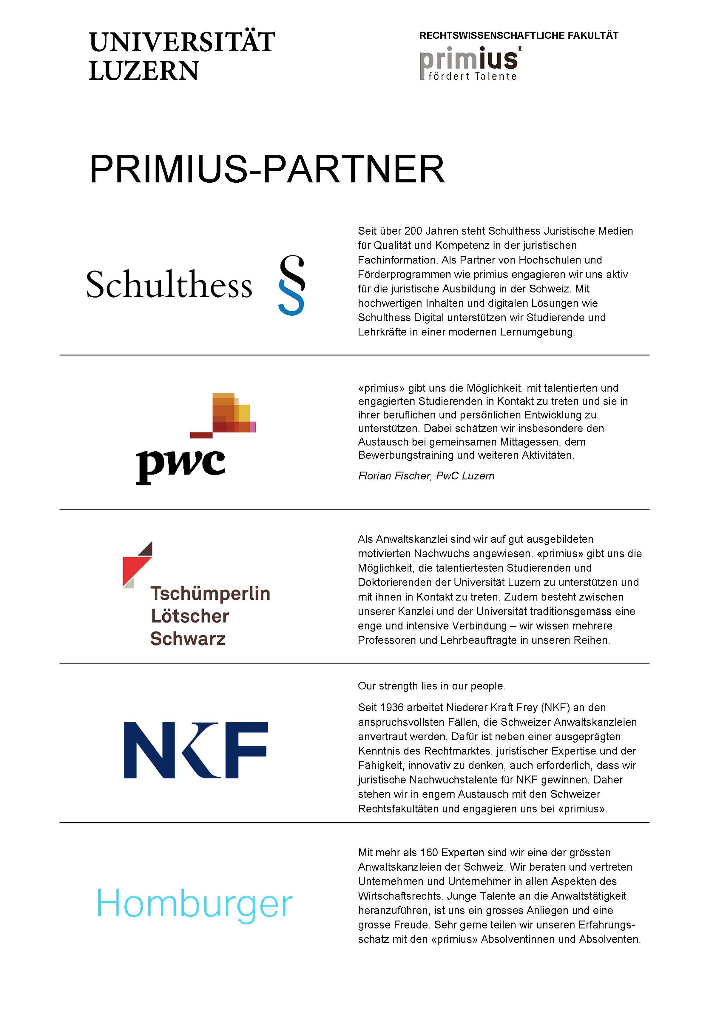 Unser herzlicher Dank gilt wiederum unseren primius-Partnern, die mit ihrer langjährigen, treuen Unterstützung all diese Aktivitäten erst möglich machen. Ihre Beiträge erlauben es uns nicht nur, ein vielfältiges Jahresprogramm zu gestalten, sondern auch Aufenthalte von Studierenden an ausländischen Universitäten zu fördern und innovative Formate zu erproben. Besonders geschätzt wird die Kreativität unserer Partner bei der Entwicklung neuer Workshops und die tatkräftige Mitwirkung bei Fachveranstaltungen, mit denen sie ihr Wissen und ihre Erfahrung direkt an die nächste Generation von Juristinnen und Juristen weitergeben. Besonders hervorzuheben sind etwa der Workshop «Arbitration – Kreuzverhör als Mittel zur Wahrheitsfindung» mit NKF und Homburger, der Besuch bei TLS im neuen Setting mit vertieften Einblicken in Kanzleikultur und Arbeitsweise sowie die Insight-Formate bei PwC, die verschiedene Berufsfelder und Karrierewege anschaulich aufgezeigt haben.