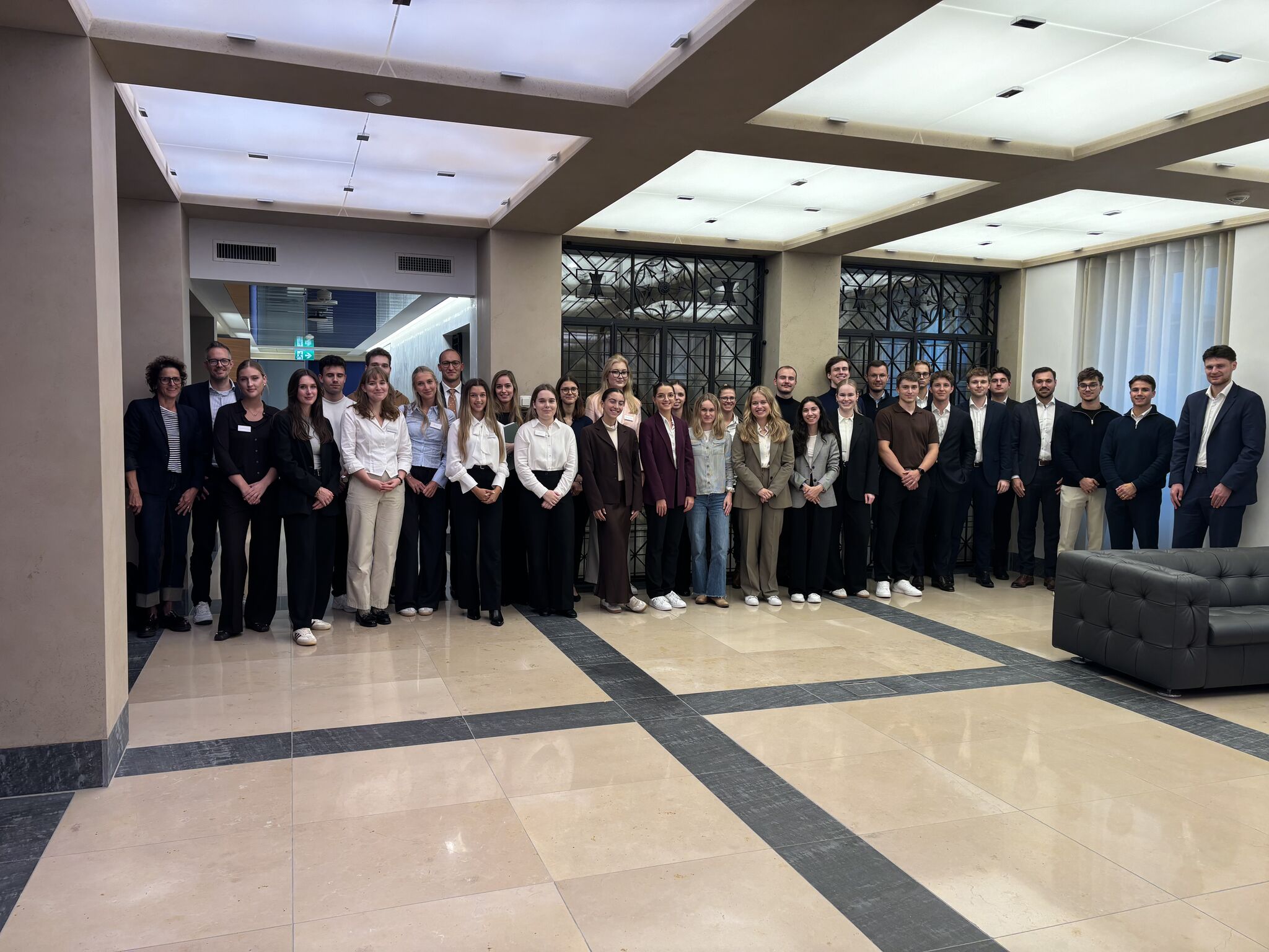 Ein Schwerpunkt des Jahres 2025 lag wiederum darauf, besondere praktische Tätigkeitsfelder für Juristinnen und Juristen aufzuzeigen. So bot der Besuch bei Botschafterin RA lic. iur. Sandra Lendenmann Winterberg und ihrem Team in der Direktion für Völkerrecht beim EDA in Bern prägende Einblicke in die Praxis des Völkerrechts und die Arbeit an der Schnittstelle von Recht, Diplomatie und Politik. In Zeiten geopolitischer Umwälzungen drängte es sich auf, den inhaltlichen Fokus auf das Völkerrecht noch im Rahmen einer weiteren Veranstaltung zu vertiefen: Prof. Dr. Isabelle van Damme vom WTO-Institut an der Universität Bern sprach in ihrem Vortrag mit dem Titel «The Reshaping of the Rules-Based Trading System» über die grossen strategischen Herausforderungen, mit denen das regelbasierte, globale Handelssystem in Zeiten des wachsenden Protektionismus und wachsender Disruption in den globalen Lieferketten konfrontiert ist.