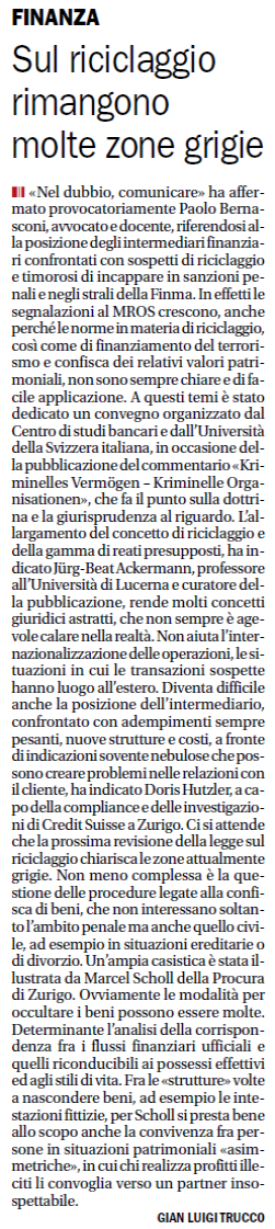 Aus Anlass der Herausgabe des Grosskommentars «Kriminelles Vermögen – Kriminelle Organisationen» fand kürzlich an der Università della Svizzera italiana (in Zusammenarbeit mit dem Centro di studi bancari) in Lugano eine Konferenz statt, worüber der Corriere del Ticino gleich anderntags einen Beitrag veröffentlichte.