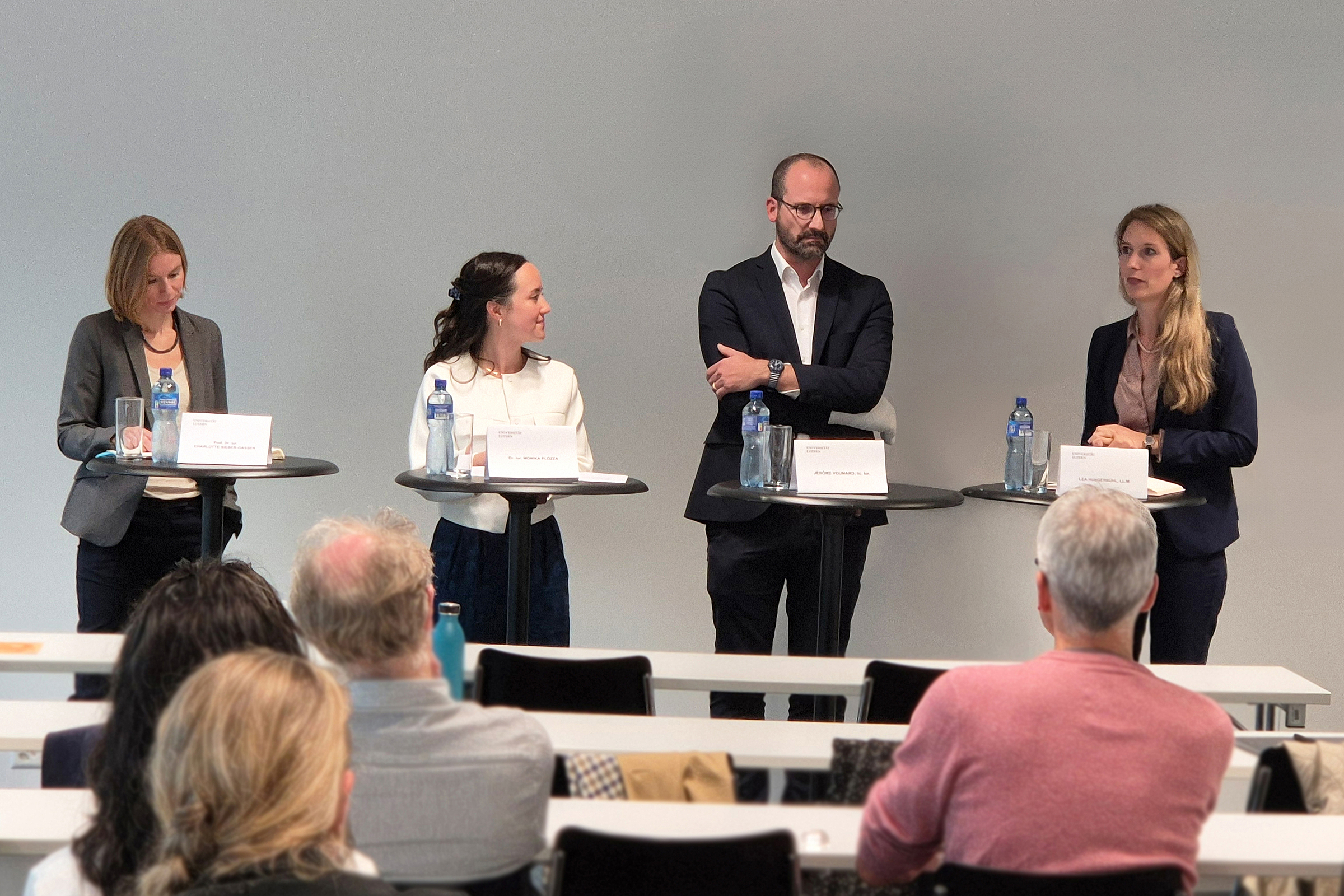 Unter der Leitung von Monika Plozza (wissenschaftliche Oberassistentin und Lehrbeauftragte an der Universität Luzern) diskutierten Jérôme Voumard (Programmleiter beim Verlag Helbling Lichtenhahn) Lea Hungerbühler (Rechtsanwältin und Vorstandsmitglied des Online Kommentars) sowie Charlotte Sieber-Gasser (Zeitschrift sui generis und u.a. Assistenzprofessorin an der Zurich Law School) über Open Access in den Rechtswissenschaften.