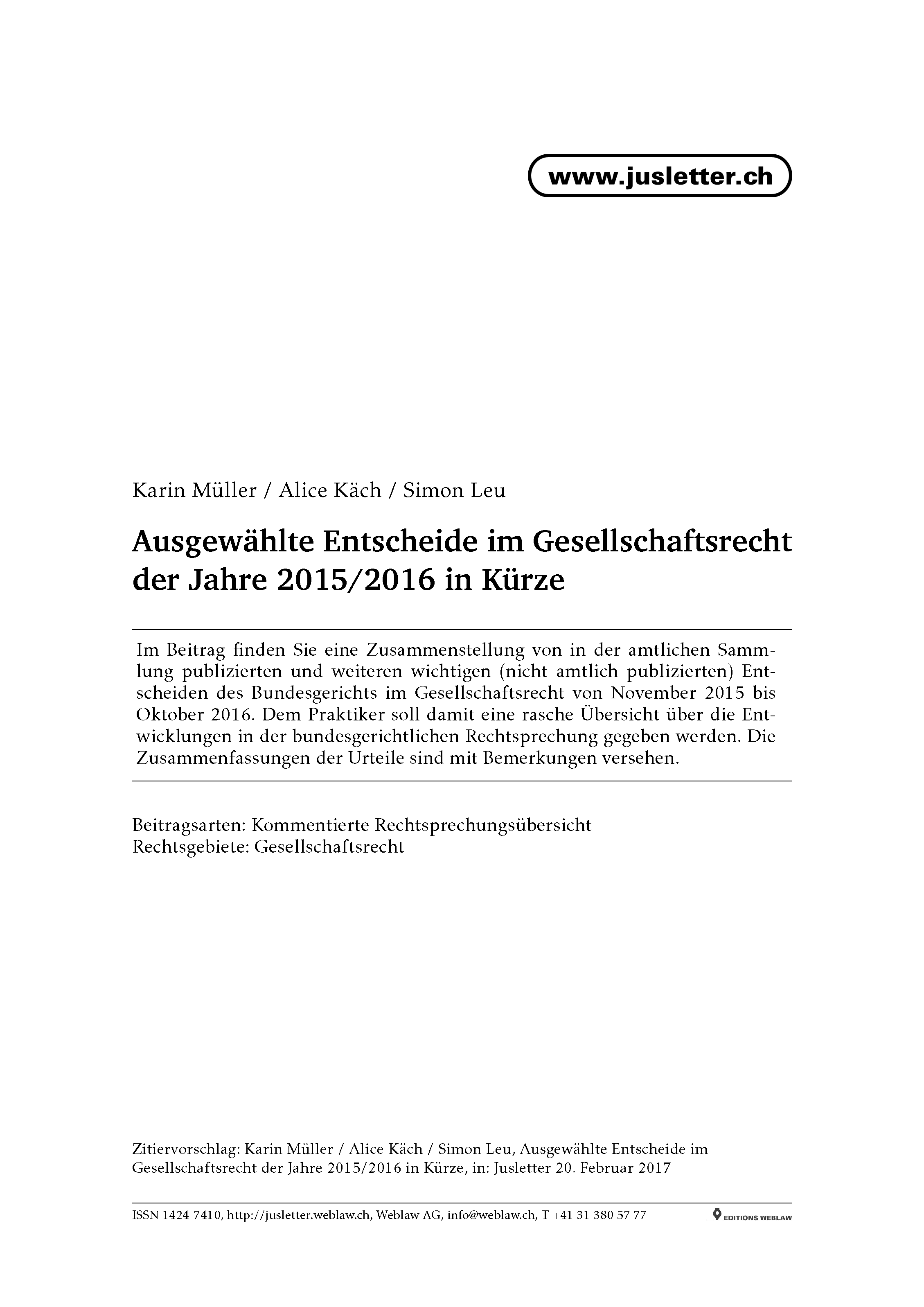 - Müller Karin/Käch Alice/Leu Simon, Ausgewählte Entscheide im Gesellschaftsrecht der Jahre 2015/2016 in Kürze, in: Jusletter 20. Februar 2017, https://doi.org/10.5281/zenodo.1309187