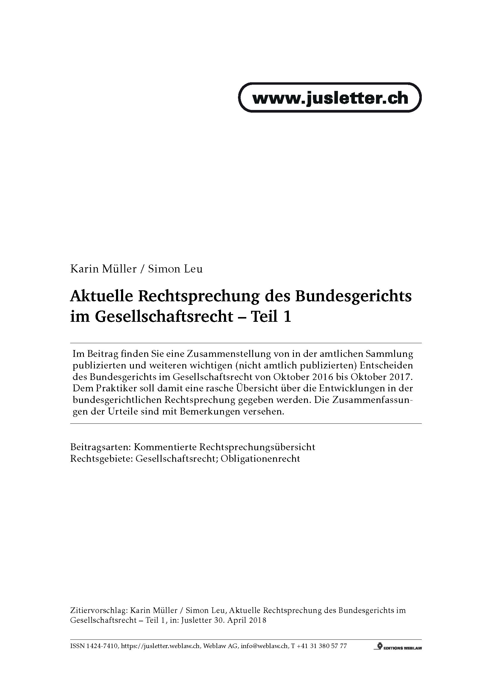 - Müller Karin/Leu Simon, Aktuelle Rechtsprechung des Bundesgerichts im Gesellschaftsrecht – Teil 1, in: Jusletter 30. April 2018, https://doi.org/10.5281/zenodo.1305193