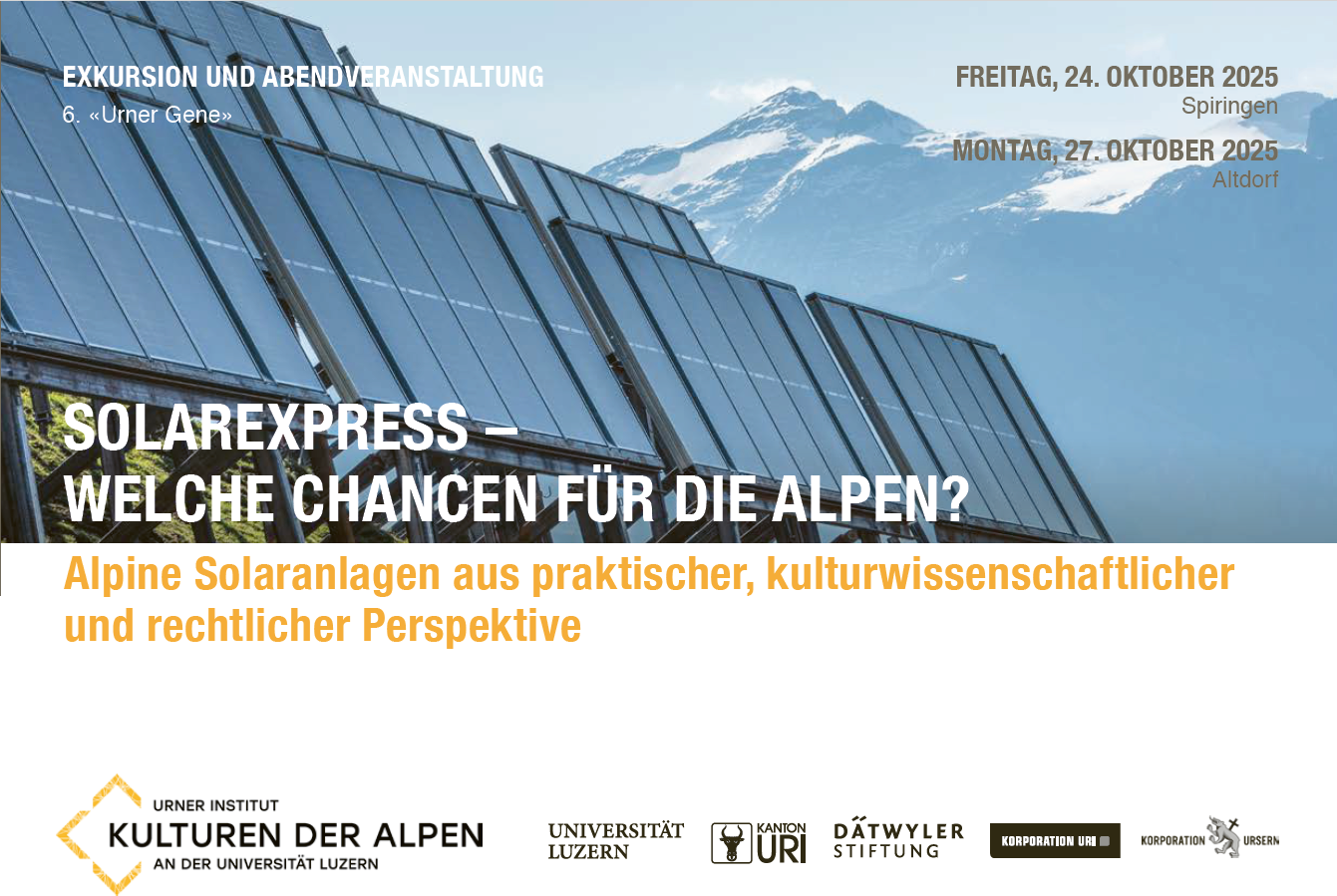 Die Veranstaltung beleuchtete Chancen und Herausforderungen des Solarexpress und damit weiterer alpiner Solarprojekte in den Alpen aus drei Perspektiven: Die praktische Sicht wurde durch ein Initiant, Landwirt und Älpler aus dem Simmental, vertreten. Die kulturwissenschaftliche Sicht nahm im Rahmen der Buchpräsentation von «Sonnenstrom» (2025) die Energielandschaften generell ins Visier. Im Recht schliesslich ging es um die Frage, wie sich der eilig beschlossene «Solarexpress» in die Vorgaben zur Raumplanung einfügte.