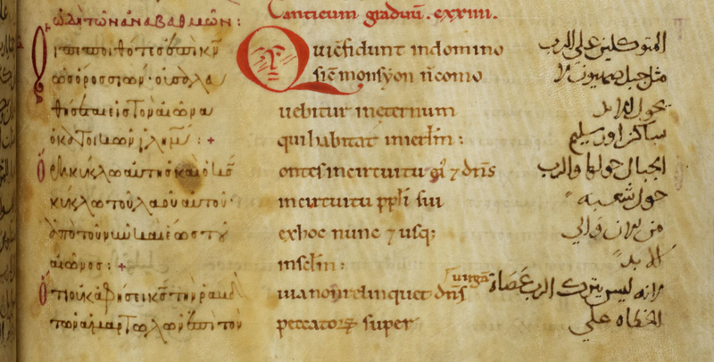 Mannigfaltige Vernetzungen: Passage aus dem «Psalter von Harley» aus dem 12. Jahrhundert, der aus einer parallelen Niederschrift der Psalmen in griechischer, lateinischer und arabischer Fassung besteht.