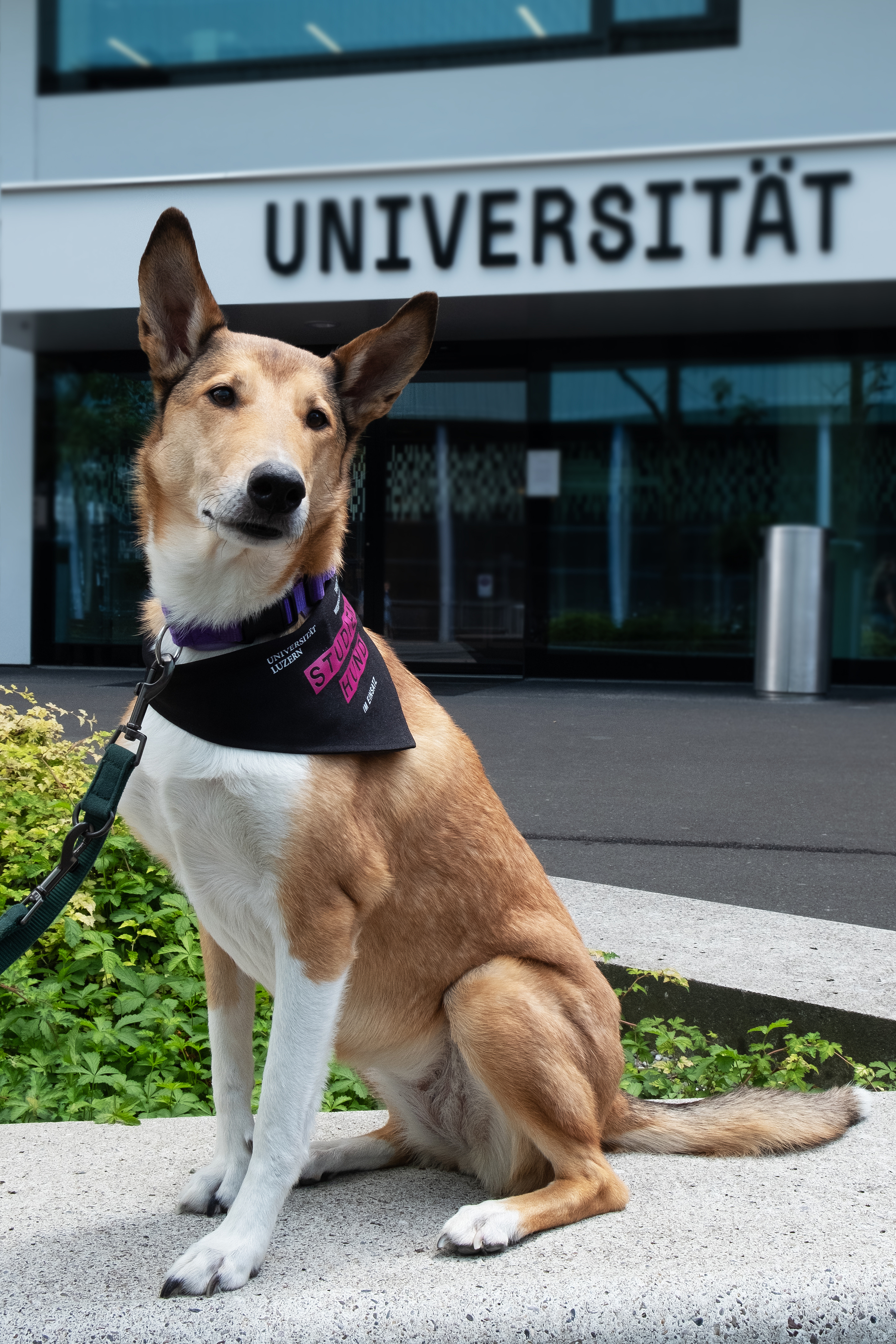 Seit Mai pendelt Mila, eine Kurzhaarcollie-Hündin, regelmässig mit ihrer Begleitperson nach Luzern, wo sie in der Regel zwei Tage pro Woche an der Universität verbringt. Möglich ist das dank einer Bewilligung, die ihr den Aufenthalt im Gebäude erlaubt – erkennbar an ihrem «Studienhund-Bandana». Während auf dem Campus oft Trubel herrscht, bleibt Mila die Ruhe selbst. Die Zugfahrten meistert sie schlafend und beobachtet im Büro entspannt das Geschehen. Gerne holt sie sich die eine oder andere Streicheleinheit ab, bevor sie sich wieder an einem gemütlichen Plätzchen niederlässt, um zu dösen und zu entspannen – oft auch mitten im Büro.