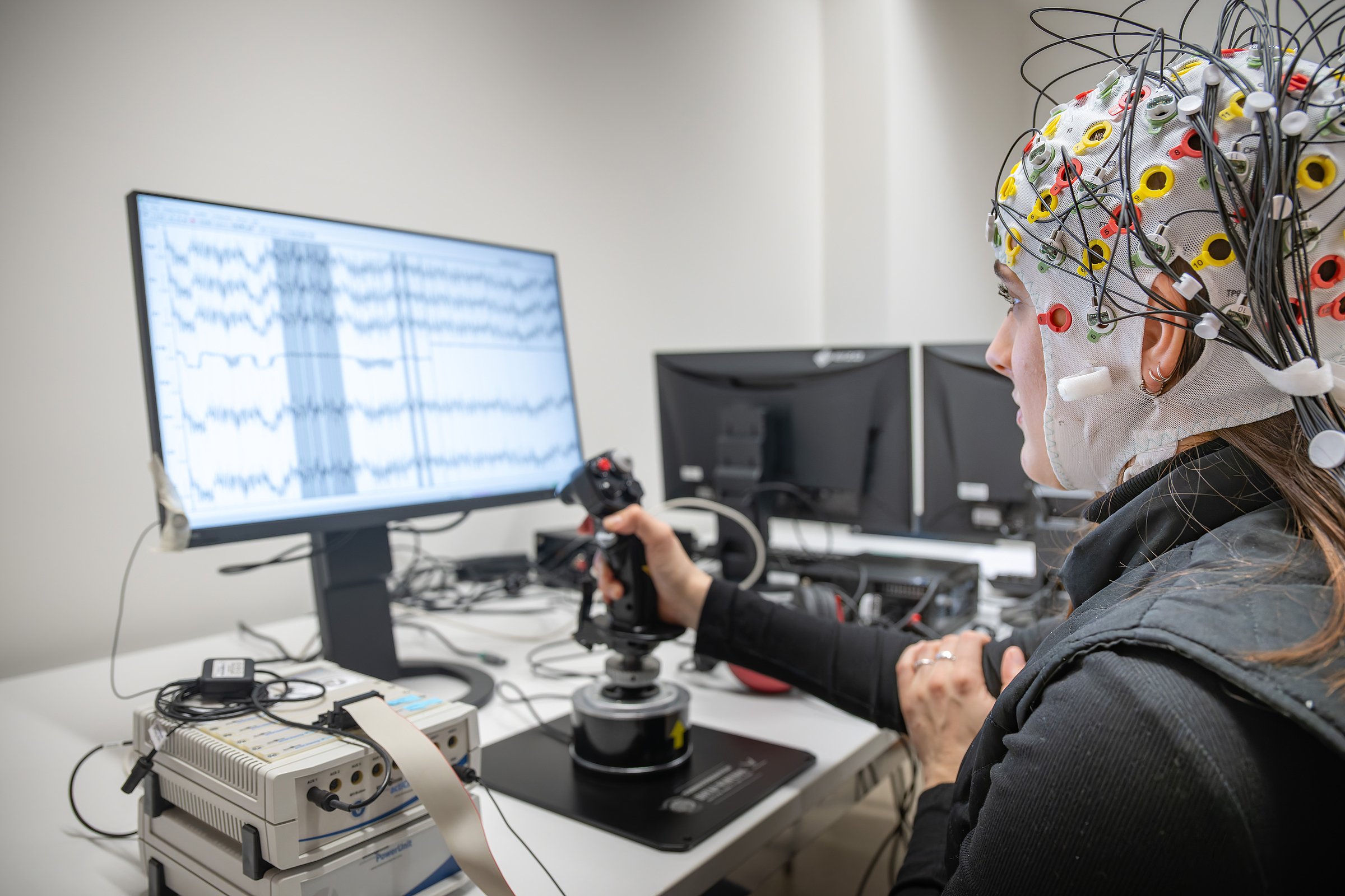Das Labor 1 ist primär auf die Erfassung neurophysiologischer und wahrnehmungsbezogener Daten ausgelegt. Es verfügt etwa über Geräte für Elektroenzephalografie (EEG), um Hirnaktivitäten zu messen, Eye-Tracking-Systeme und ermöglicht auch Hirnstimulation (z.B. transkranielle Magnetstimulation, TMS), um die Aktivität von Nervenzellen im Gehirn gezielt zu beeinflussen.