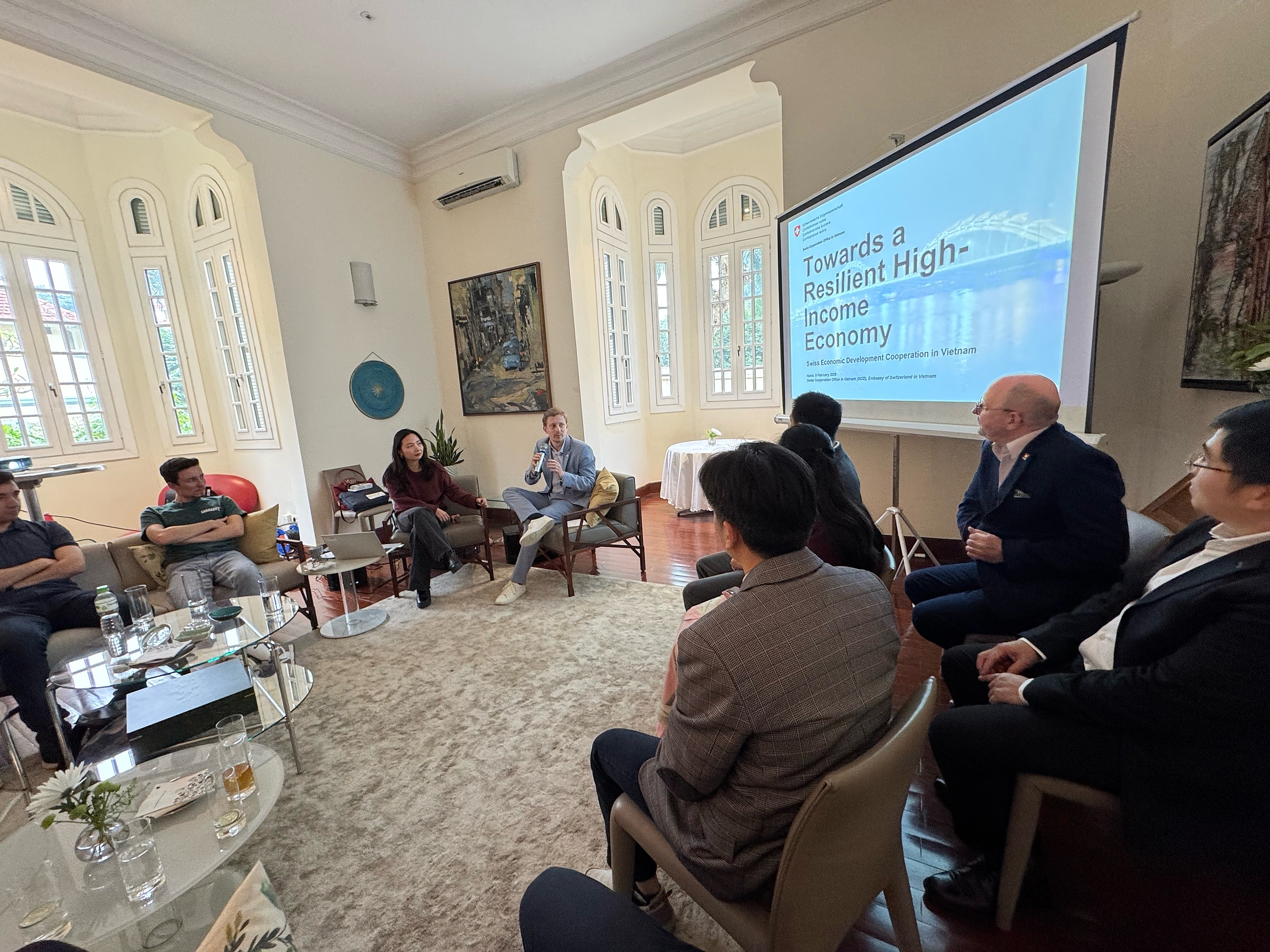 Ein besonderes Highlight war die Einladung in die Schweizer Residenz in Hanoi. Botschafter Thomas Gass und sein Team hießen die Gruppe willkommen und gaben Einblicke in das wirtschaftliche und entwicklungspolitische Engagement der Schweiz in Vietnam. Der stellvertretende Leiter der Entwicklungszusammenarbeit, Andri Meier, gab einen Überblick über die Entwicklungsprioritäten der Schweiz in der Region. Dieser Austausch verband die Strategie des Privatsektors mit internationaler Zusammenarbeit und öffentlicher Politik.