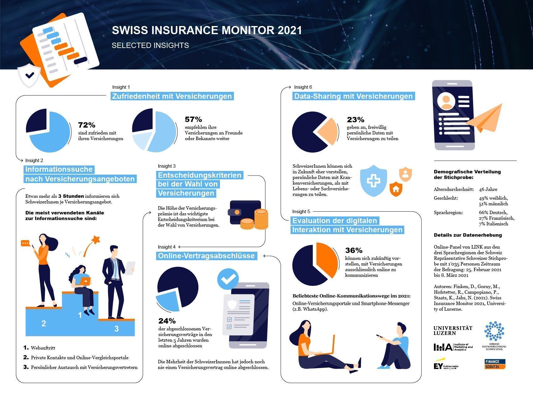 Der am 15. April veröffentlichte Swiss Insurance Monitor 2021 ist das Ergebnis der ersten Durchführung einer jährlich geplanten Studienreihe der Universität Luzern zur allgemeinen Wahrnehmung von Versicherungen und der Einstellung gegenüber der Schweizer Versicherungslandschaft. Das für die Schweiz repräsentative Studienformat entstand unter der Leitung von Prof. Dr. Reto Hofstetter (Universität Luzern) in Zusammenarbeit mit dem Verband Digitalversicherungen Schweiz, der EY Schweiz AG und FinanceScout24.