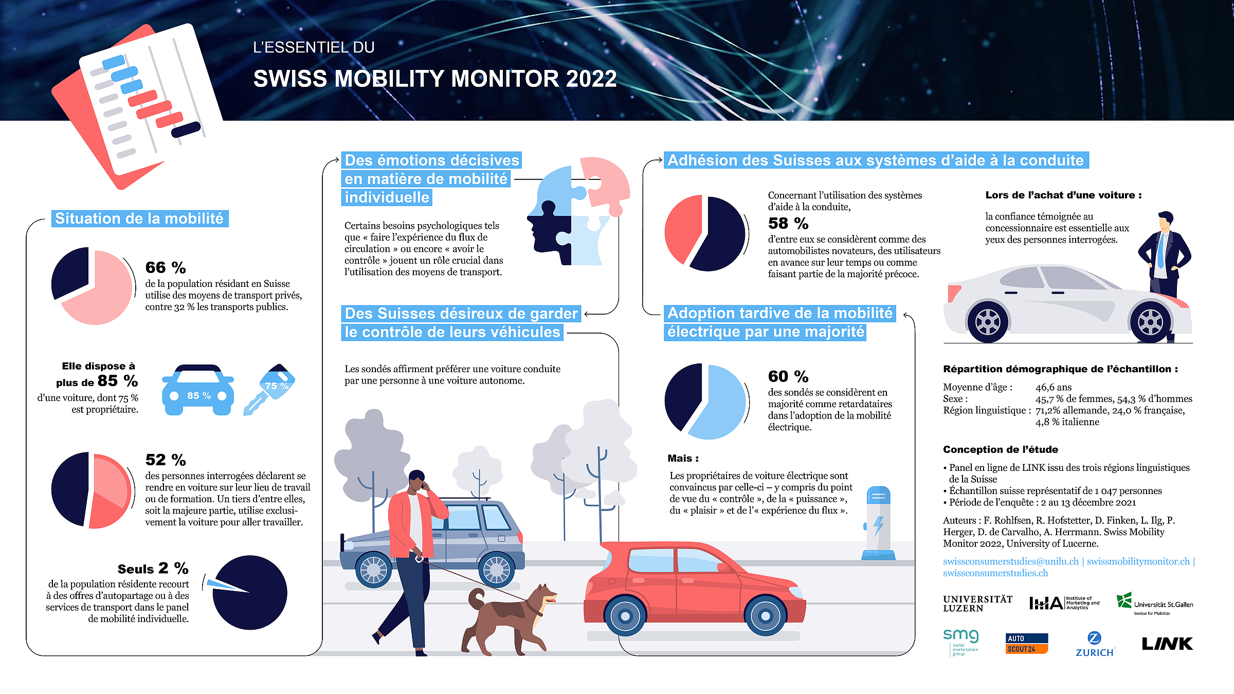 L’étude «Swiss Mobility Monitor», publiée le 17 mars 2022, se concentre sur les motivations et les besoins qui retiennent ou encouragent la population vivant en Suisse à adopter de nouvelles formes de mobilité. L’étude est le résultat d’une enquête inédite représentative de la population suisse, menée sous la direction scientifique des professeurs Reto Hofstetter (Université de Lucerne) et Andreas Herrmann (Université de Saint-Gall). L’étude Swiss Mobility Monitor 2022 a été réalisée en collaboration avec l’Institut pour la mobilité de l’Université de Saint-Gall, la compagnie d’assurance Zurich et AutoScout24. Les conclusions de l’étude constituent pour les chercheurs une base de référence pour des projets ultérieurs, et offrent aux experts du marketing et de la vente des pistes concrètes pour développer des stratégies visant la commercialisation future d’innovations en matière de mobilité, telles que les véhicules électriques, l’autopartage ou les offres de mobilité multimodale, c.-à-d. l’utilisation de plusieurs formes de mobilité dans le cadre d’un même trajet.